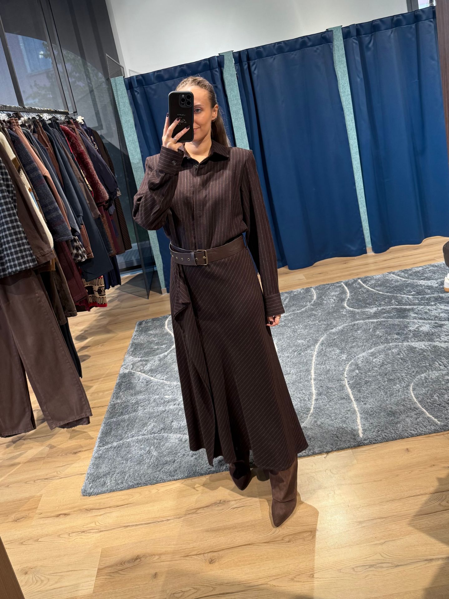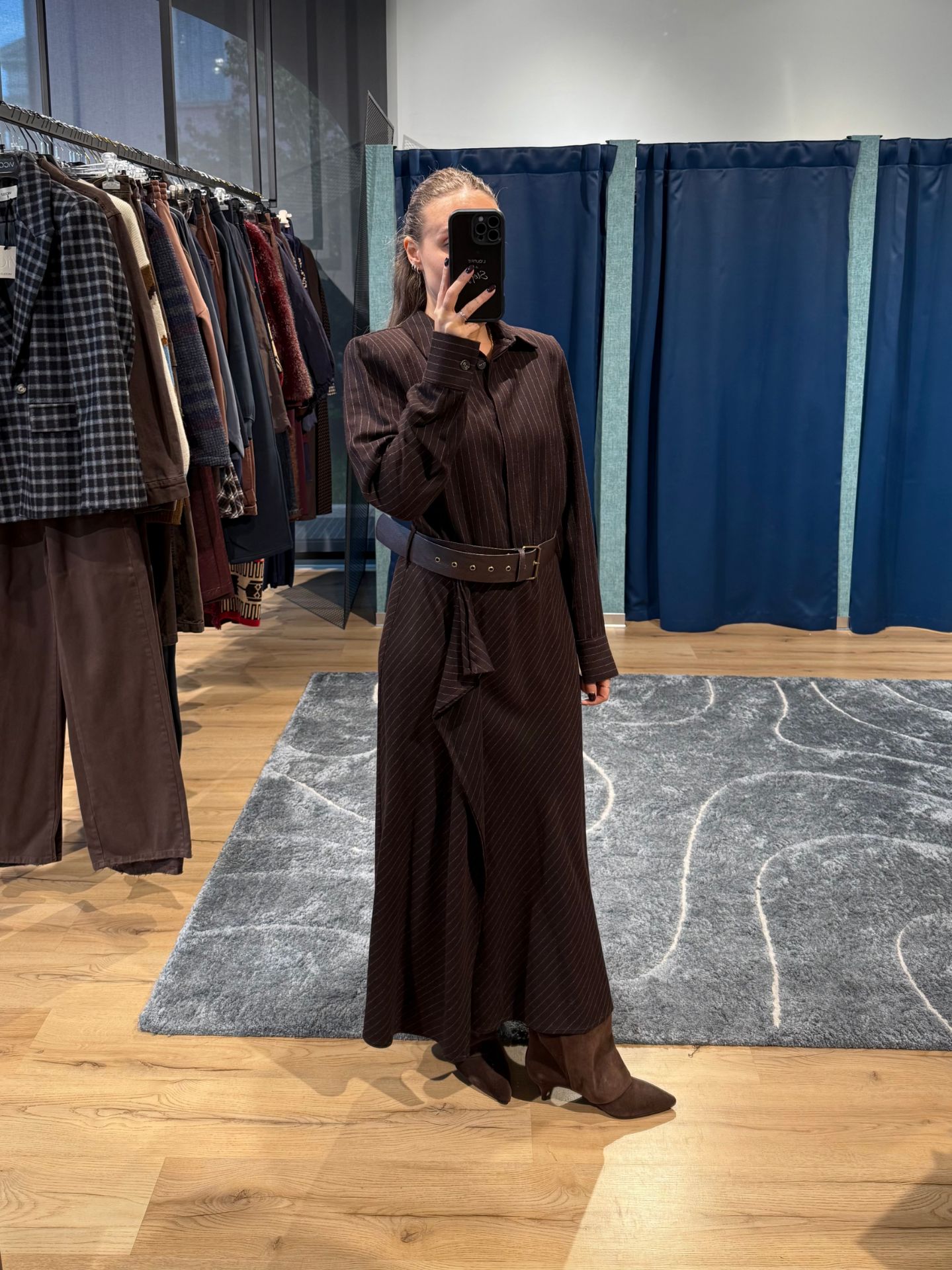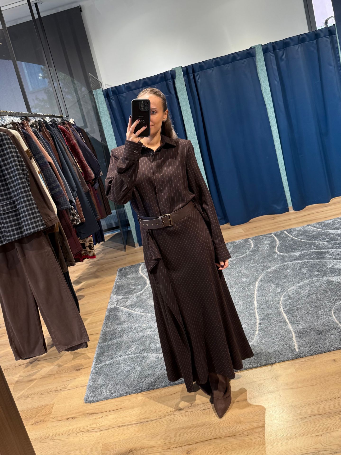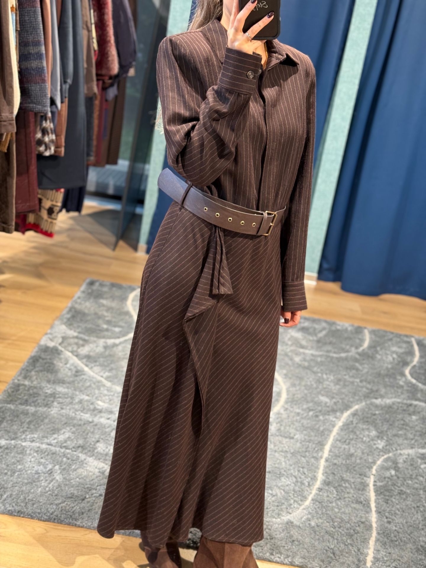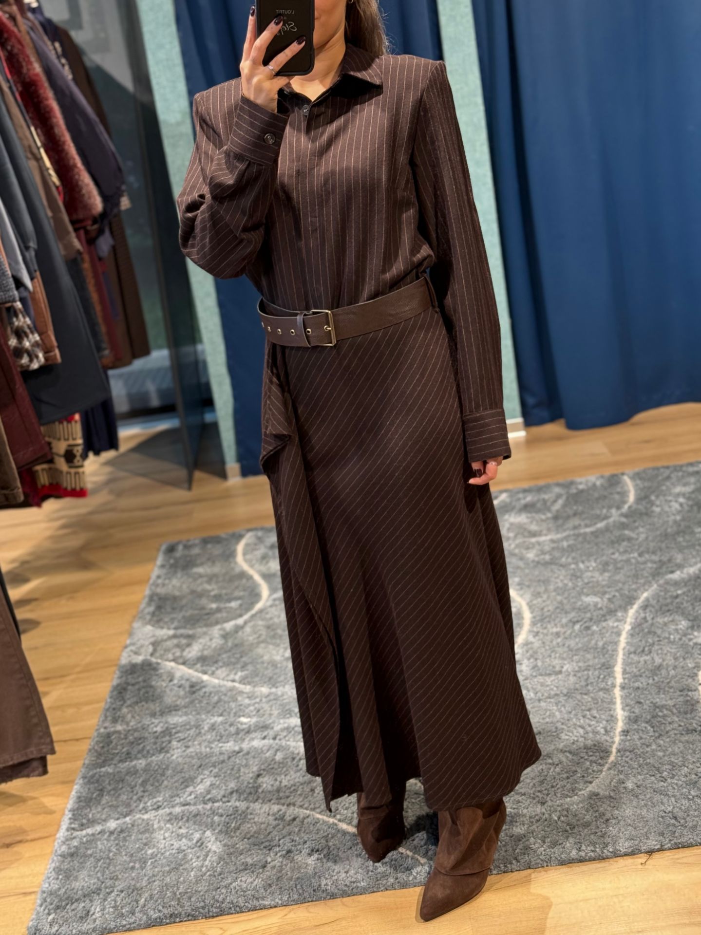 Abito lungo marrone con cintura in vita, gessato.