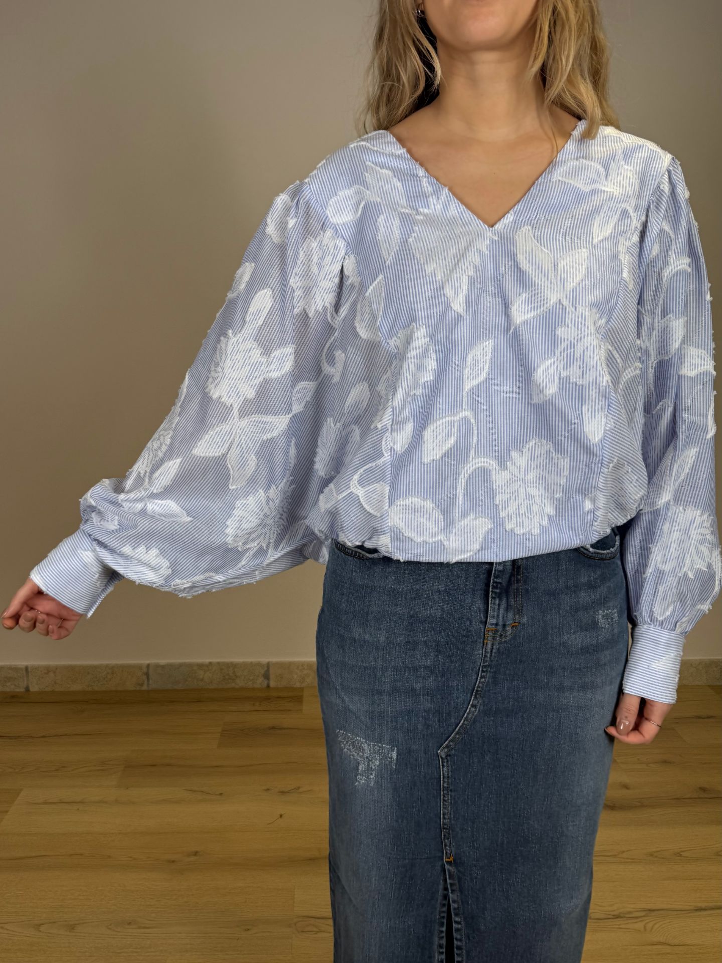 Blusa azzurra con dettagli a fiori e foglie bianche, scollo a V, elastico sul fondo.