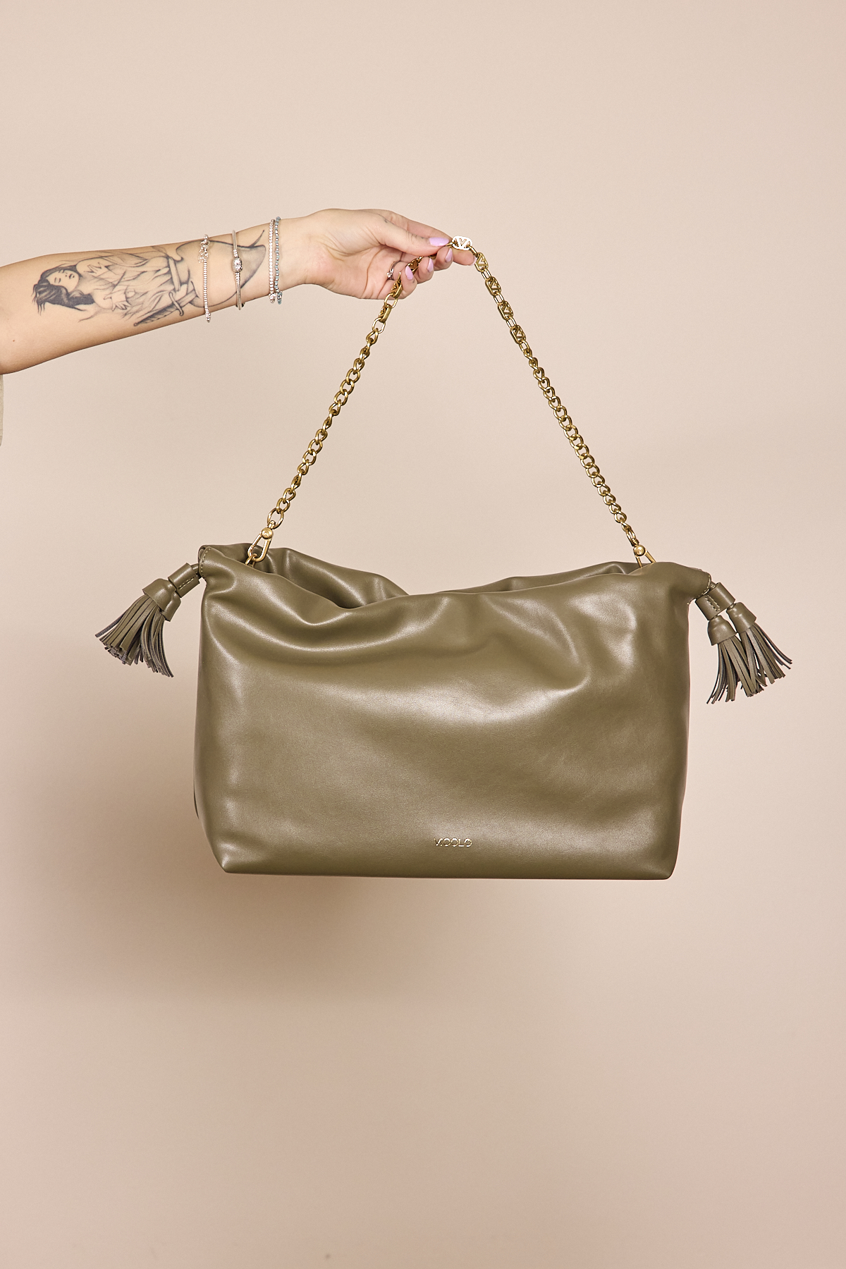 Borsa Tassel in ecopelle a spalla. Dettaglio rouches sul bordo. Chiusura con bottoni a pressione con calamita e coulisse in ecopelle con nappine. Dettaglio tracolla catena V metal plate Vicolo removibile. Tasca interna con cerniera e taschina piatta. Dettagli in metallo color oro.