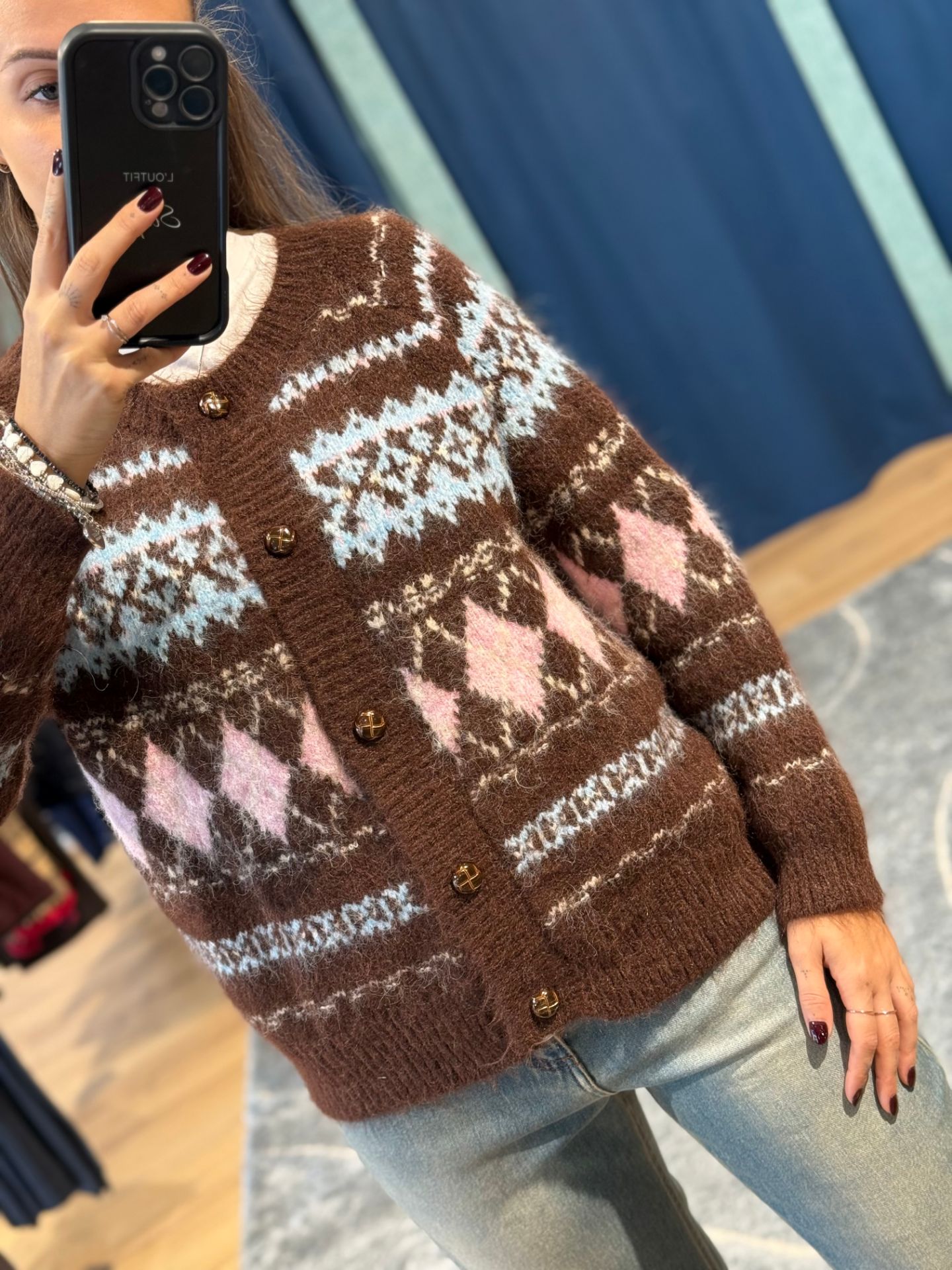 Cardigan in maglia in fantasia, base marrone, rosa, beige e azzurro. Con bottoni.