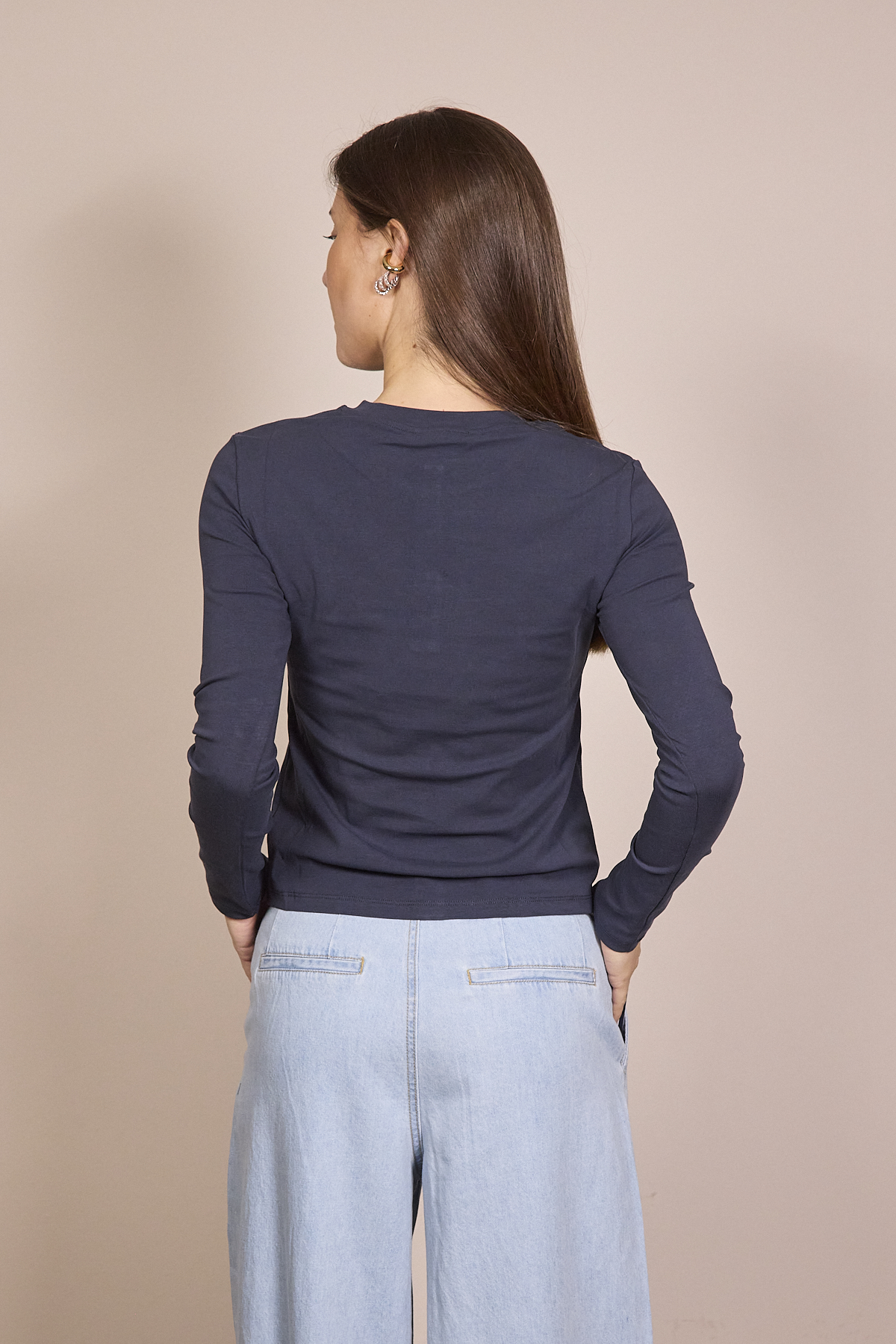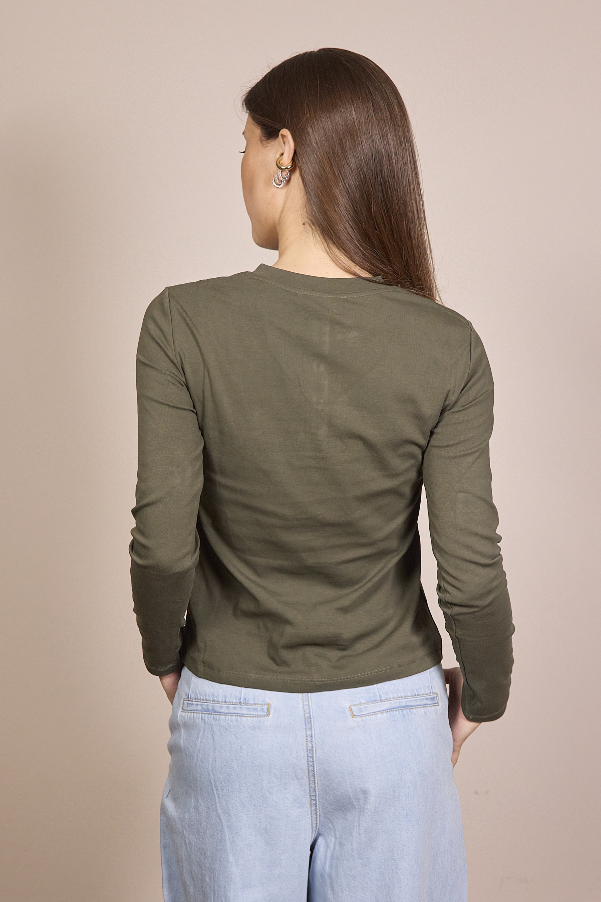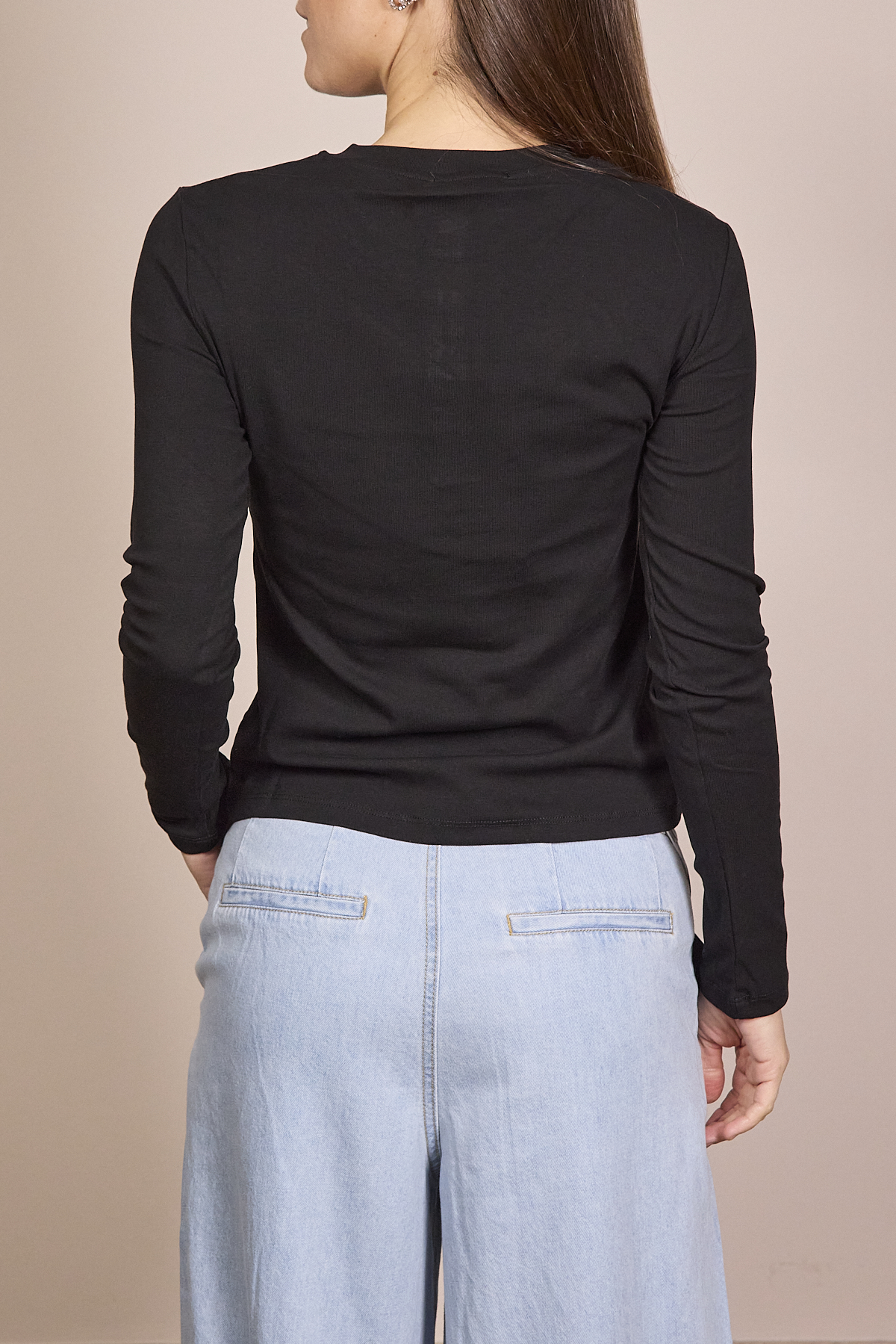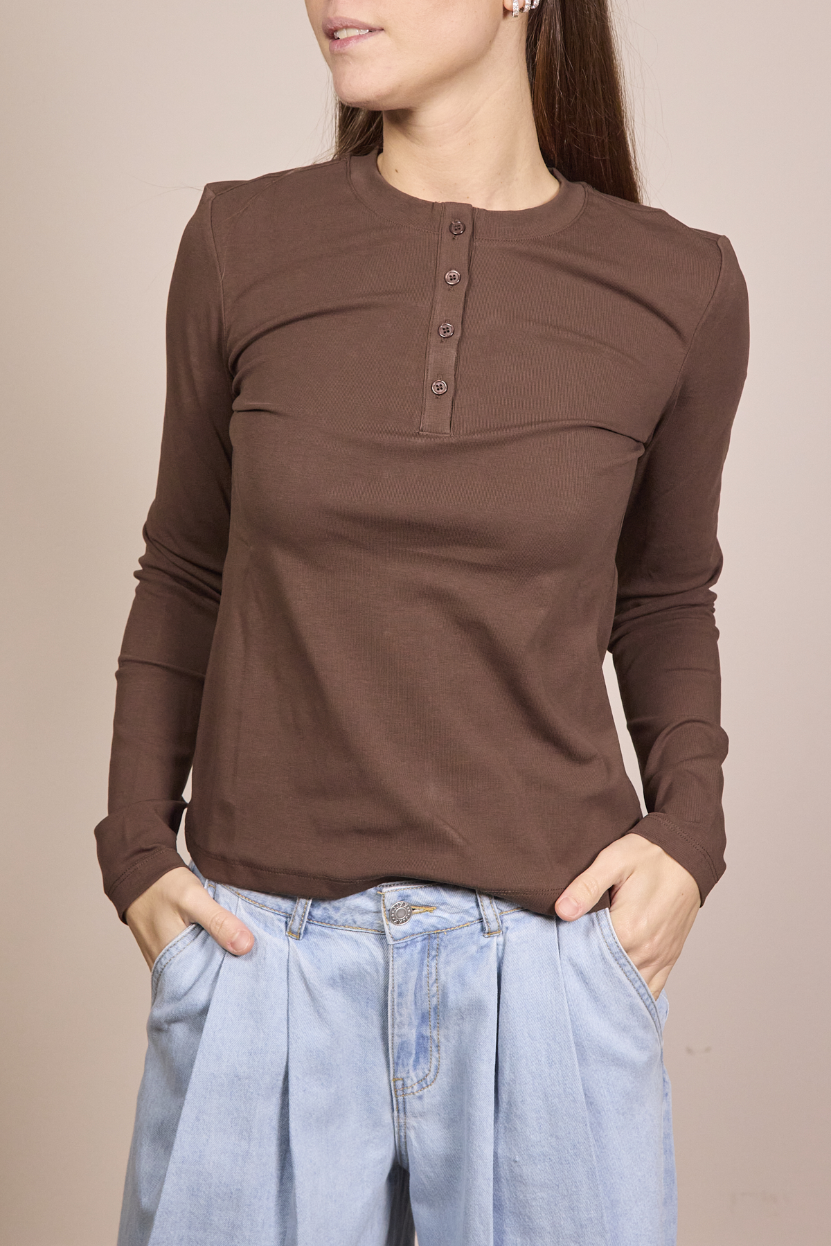 Maglia manica lunga girocollo con bottoncini, in cotone elasticizzato.