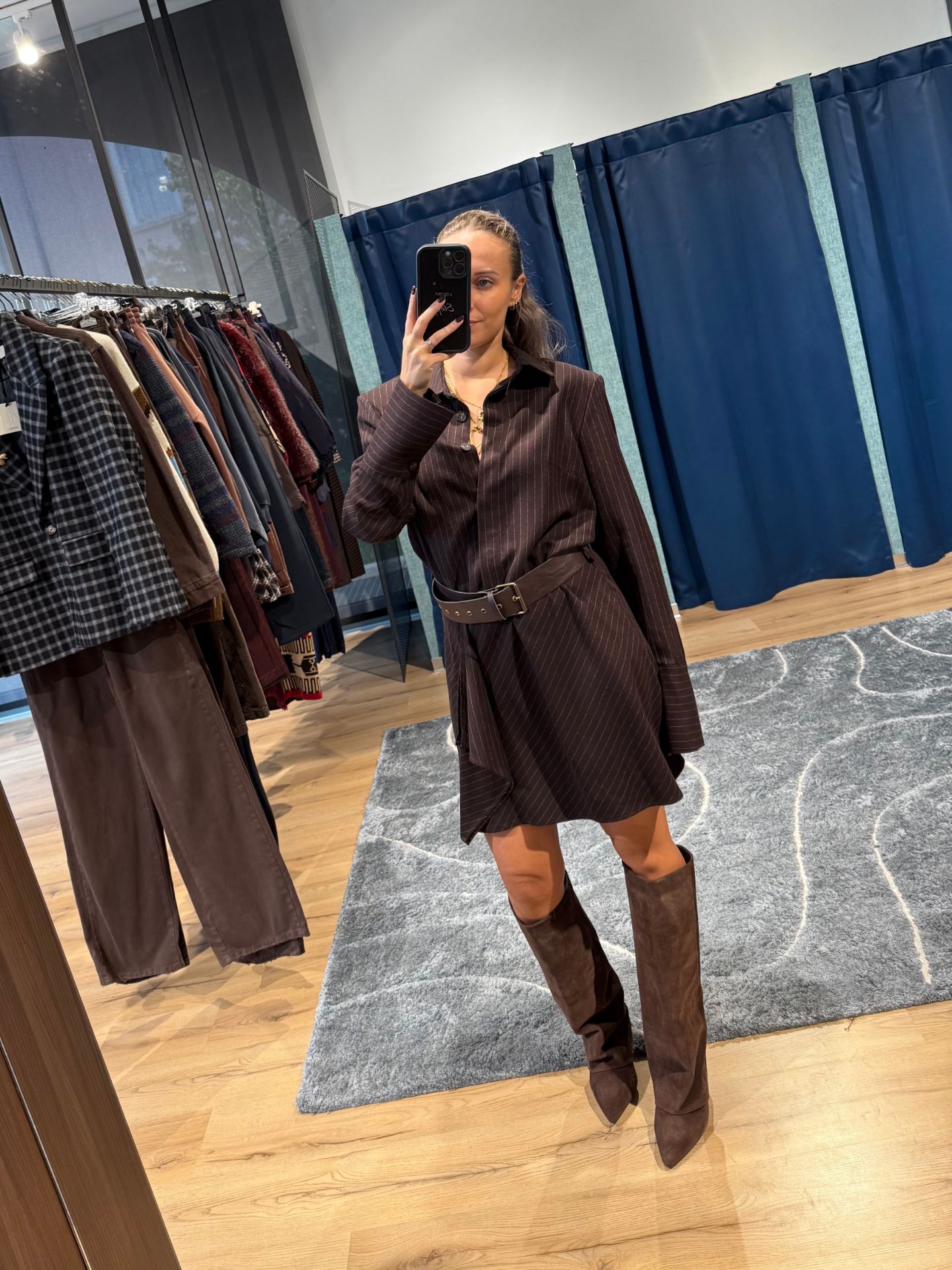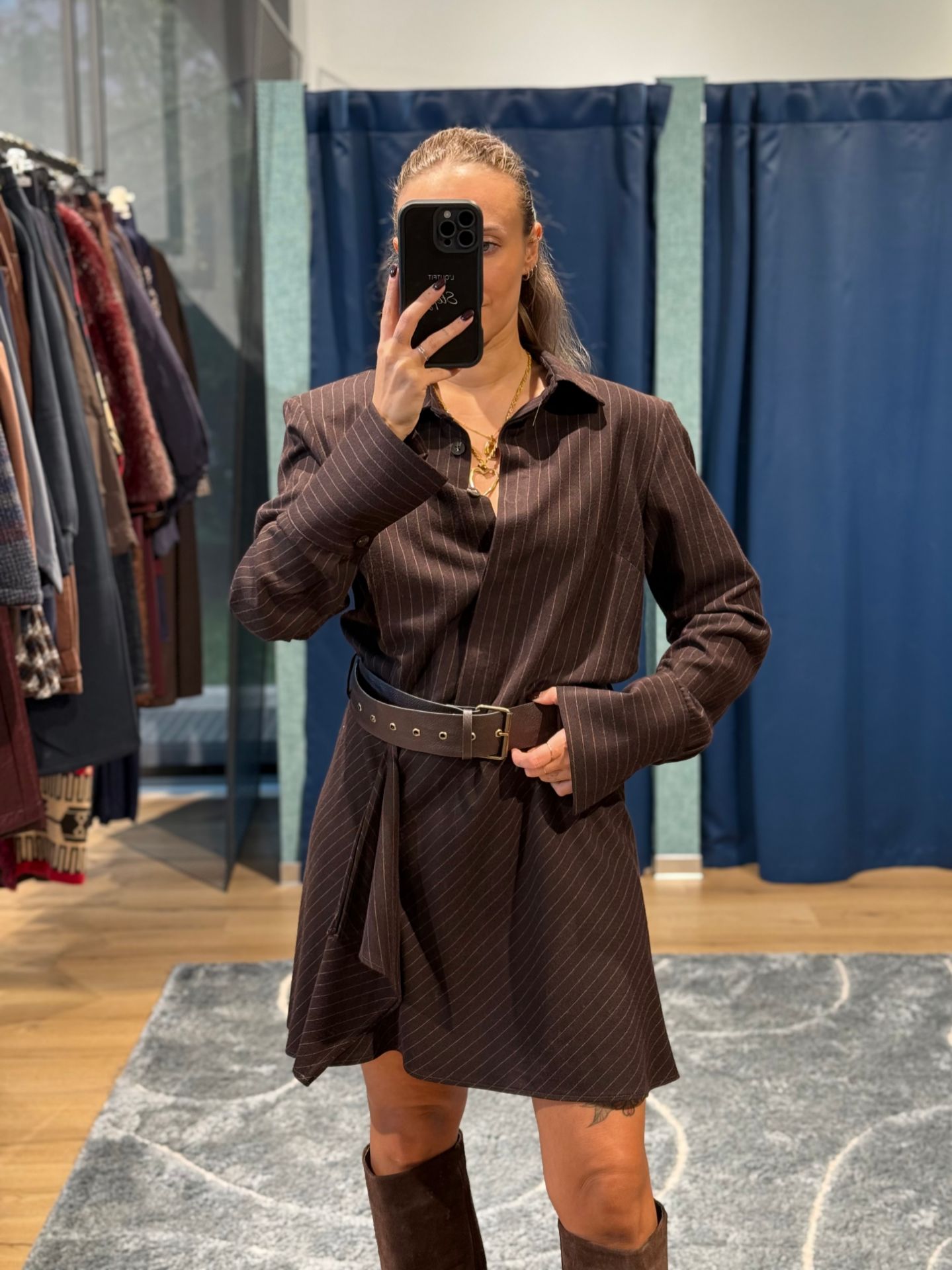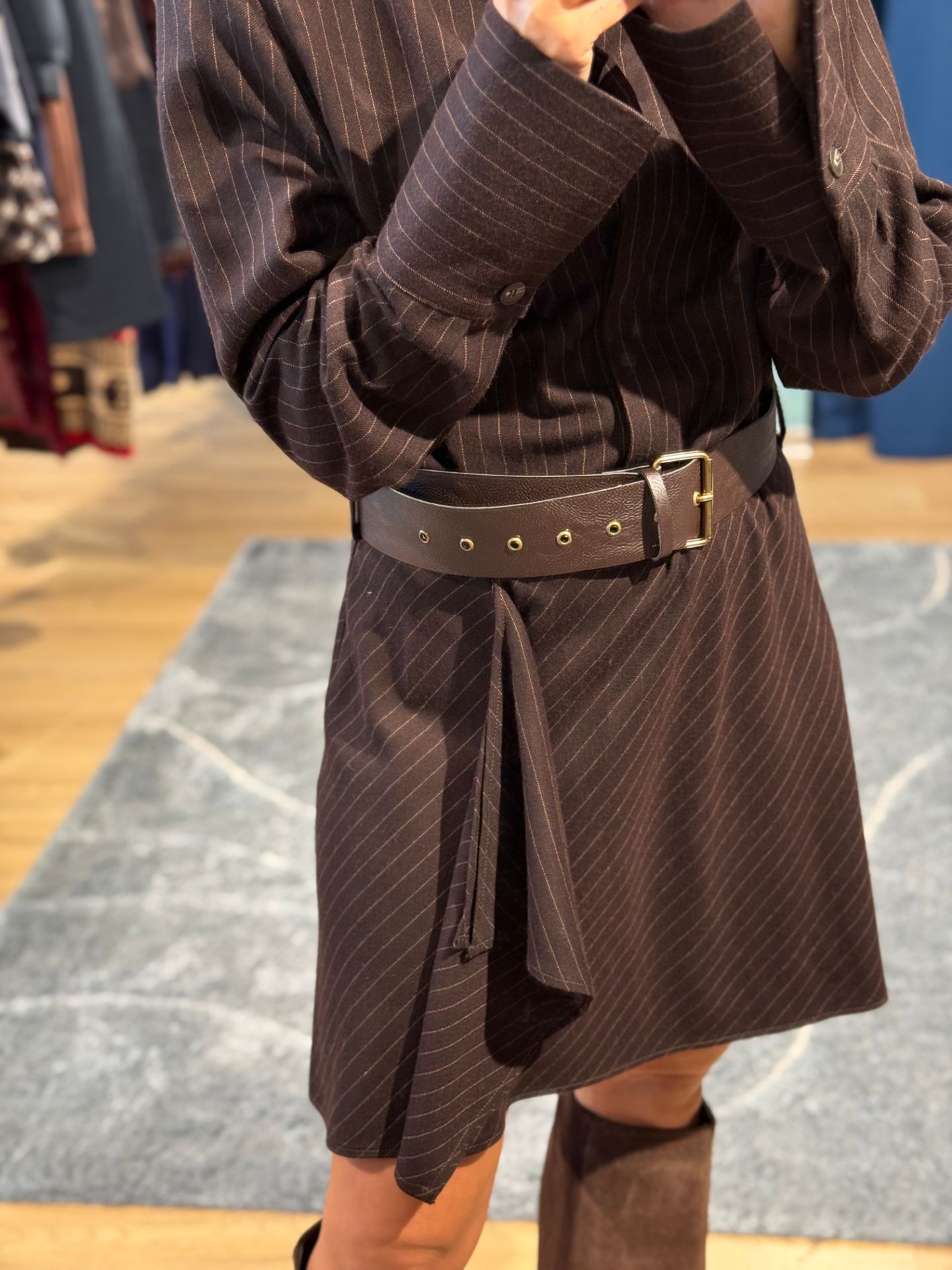 Abito corto marrone gessato.