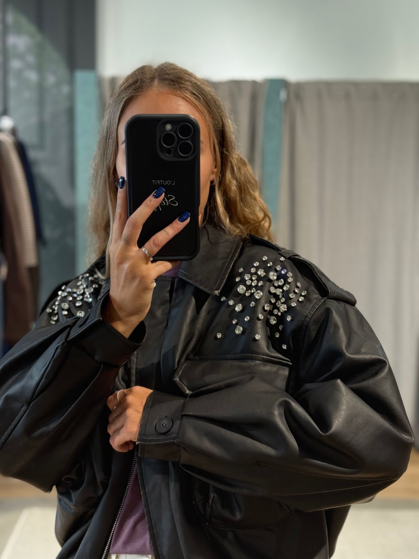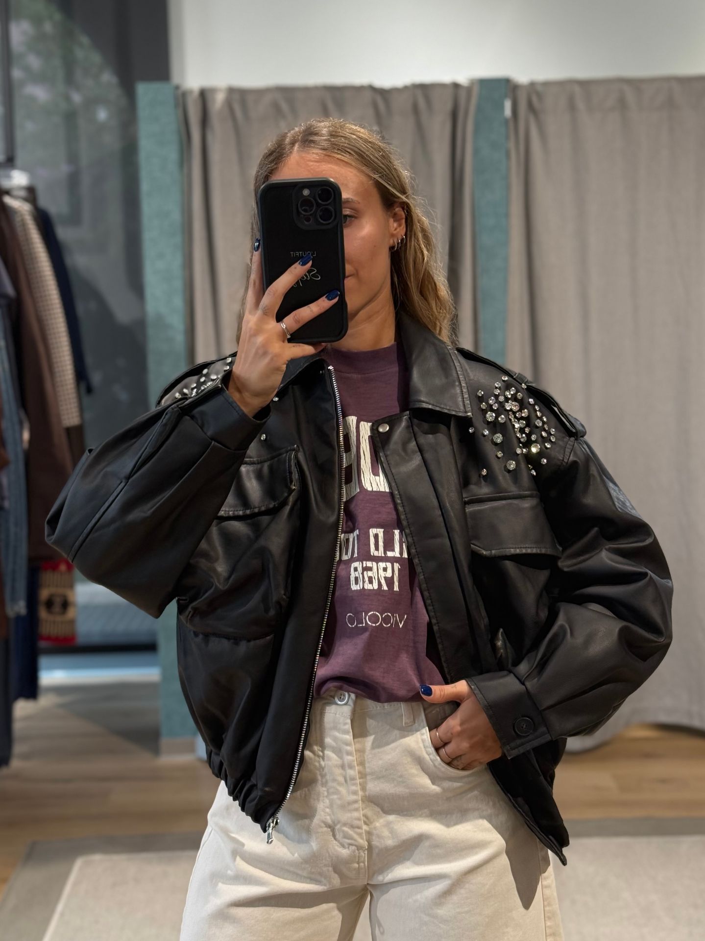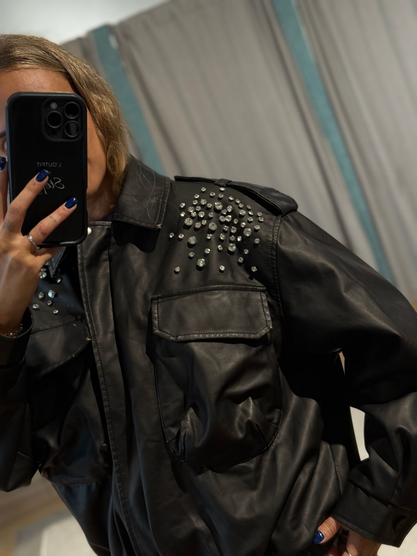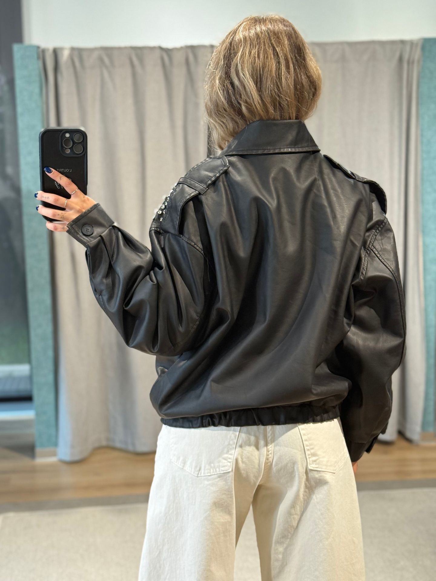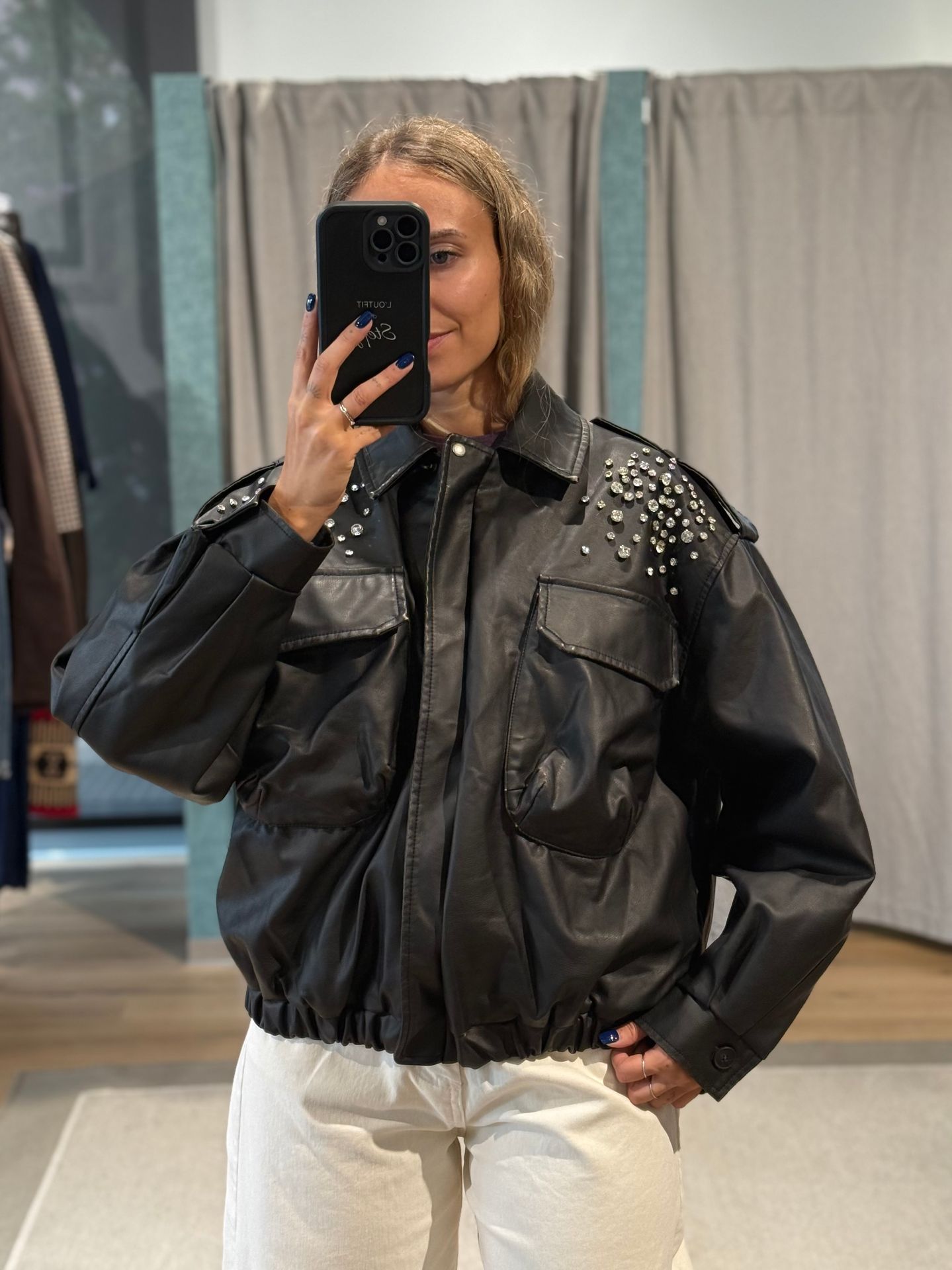 Bomber in similpelle con tasconi frontali e applicazioni gioiello, elastico in vita