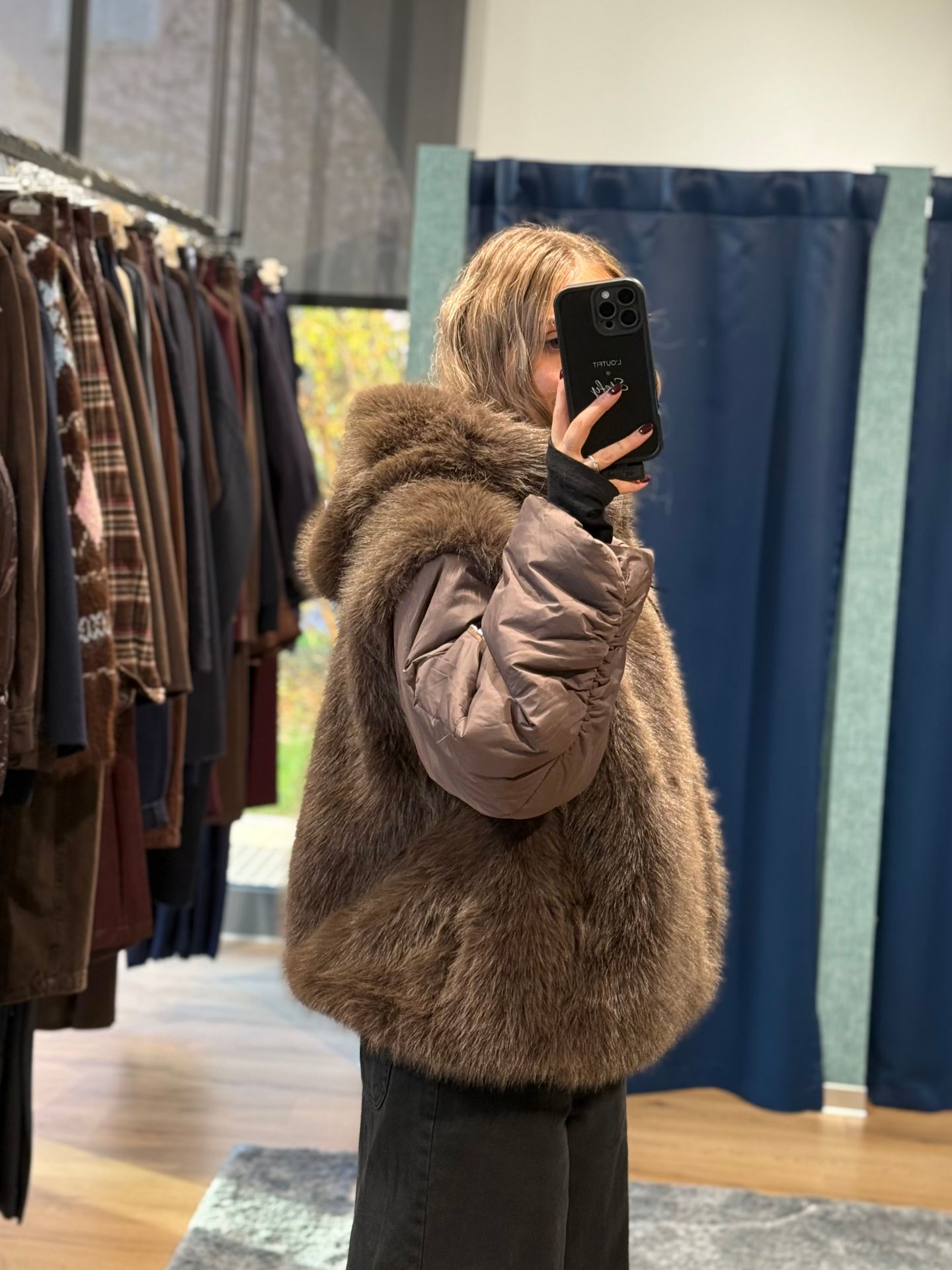 Bomber con pelliccia e cappuccio ampio. Chiusura con zip e tasche.