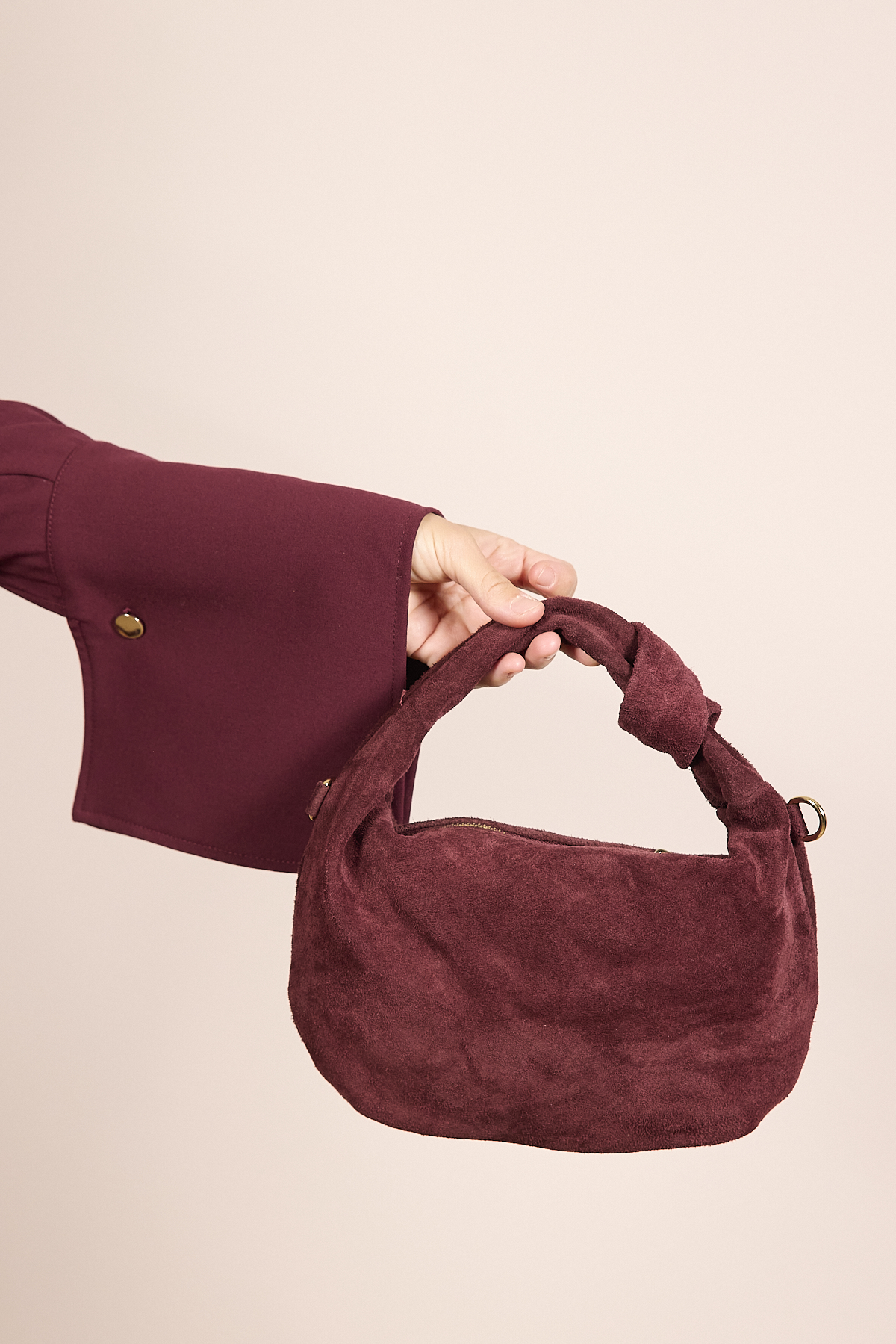 Borsa in pelle scamosciata con nodo, chiusura con zip e tracolla removibile