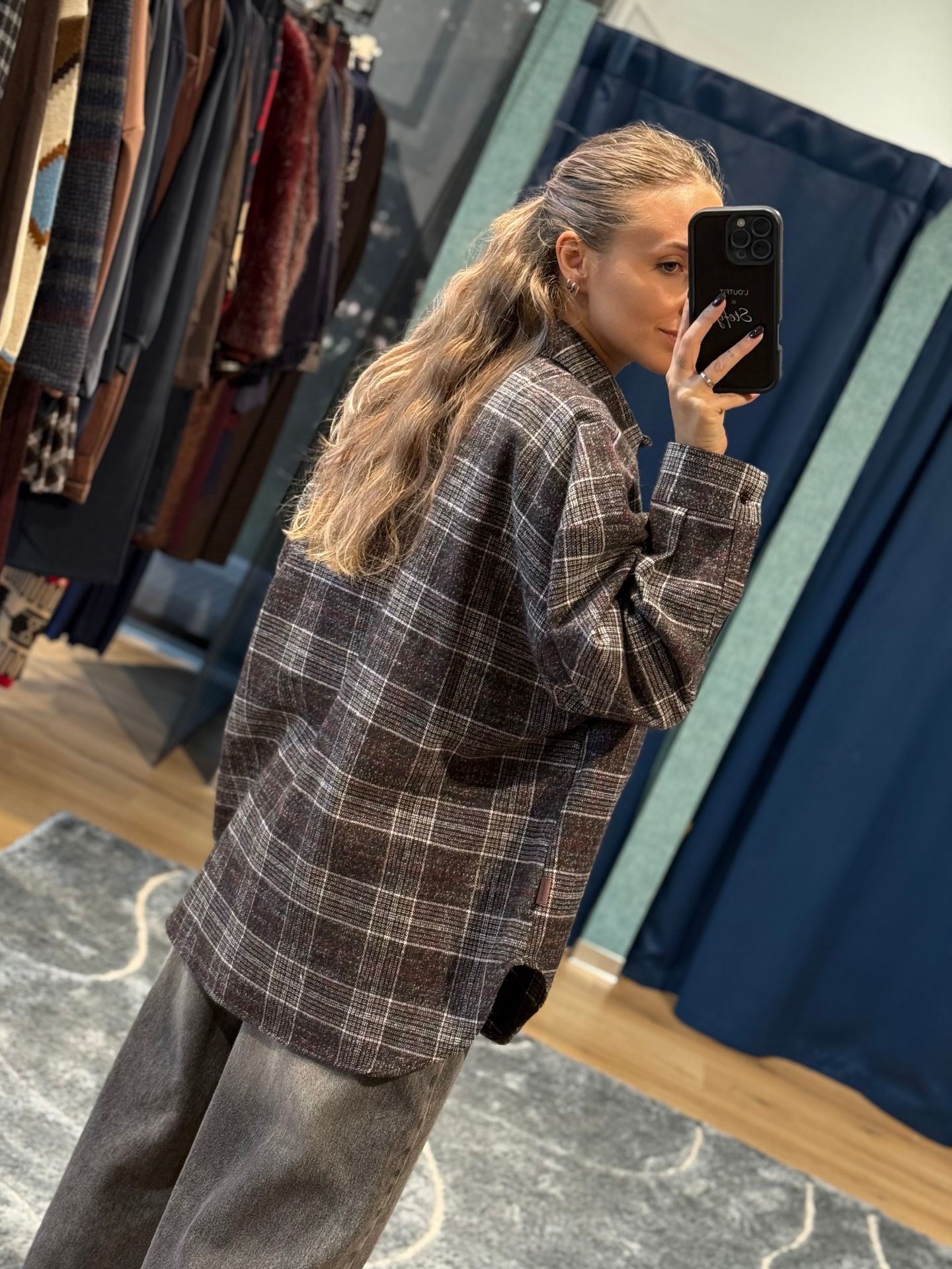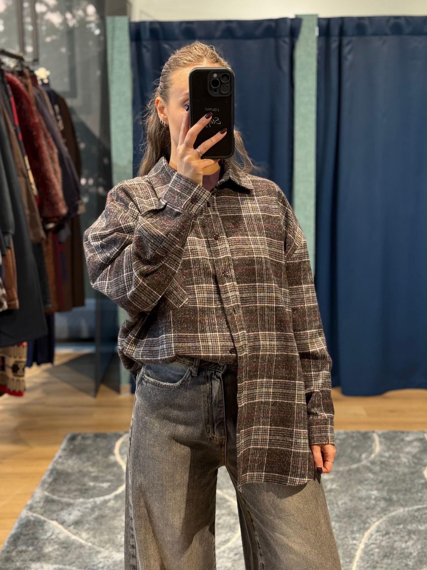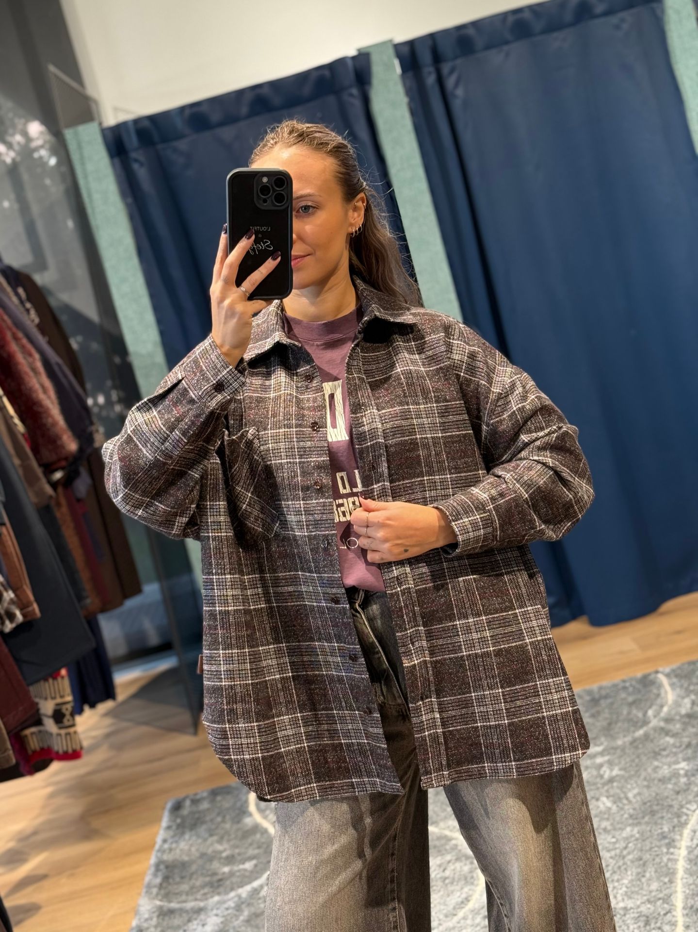 Camicia a quadri sui toni del marrone, nero e bordeaux. 72% Cotone 18% Poliestere 10% Viscosa