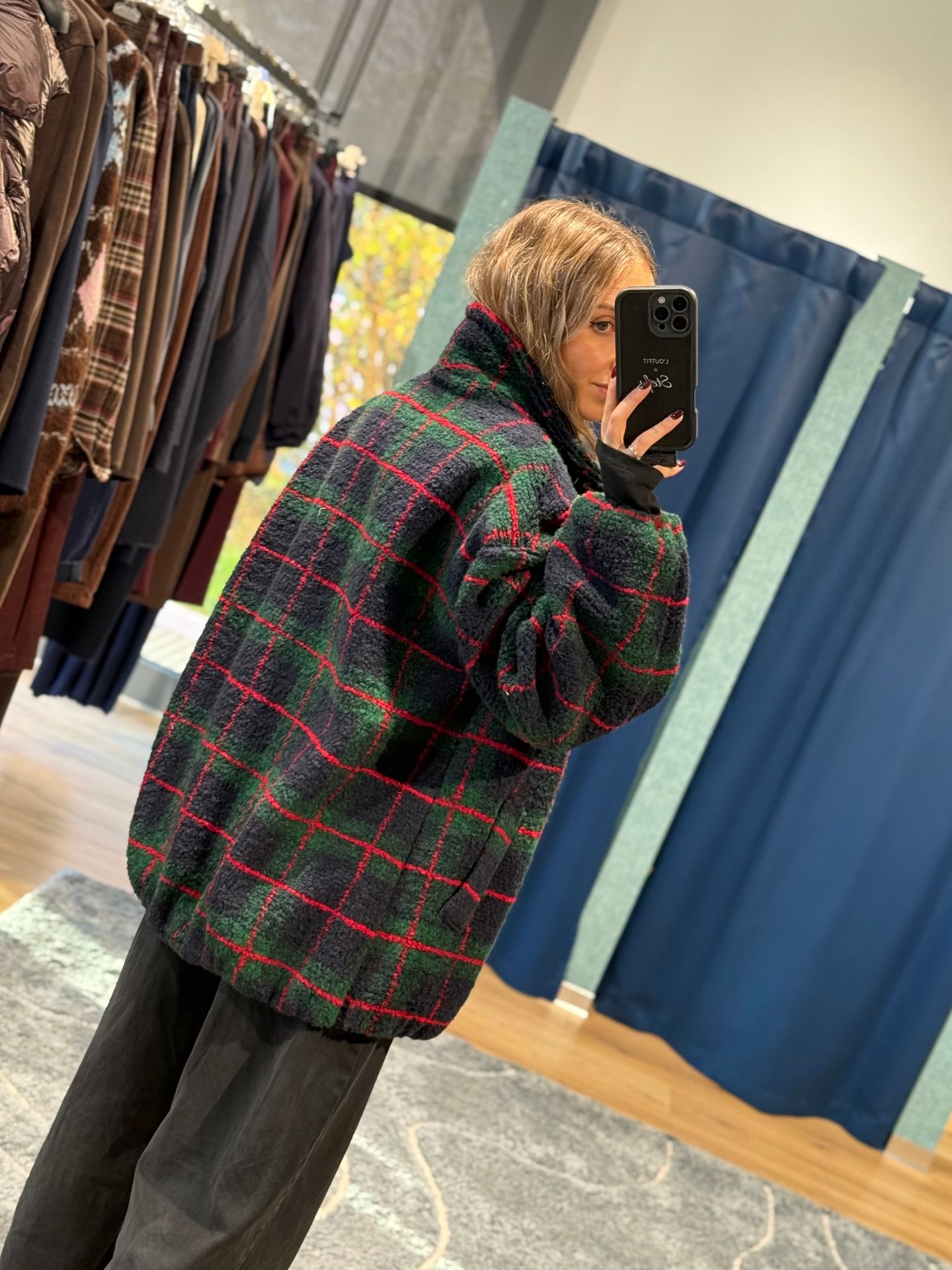 Cappottino teddy tartan, base blu, verde e rosso. Foderato, con tasche.