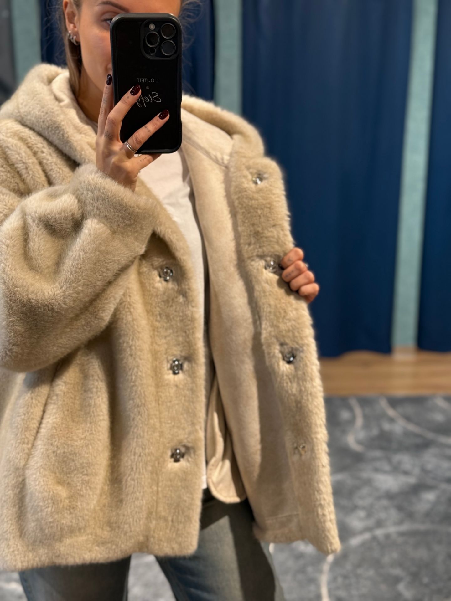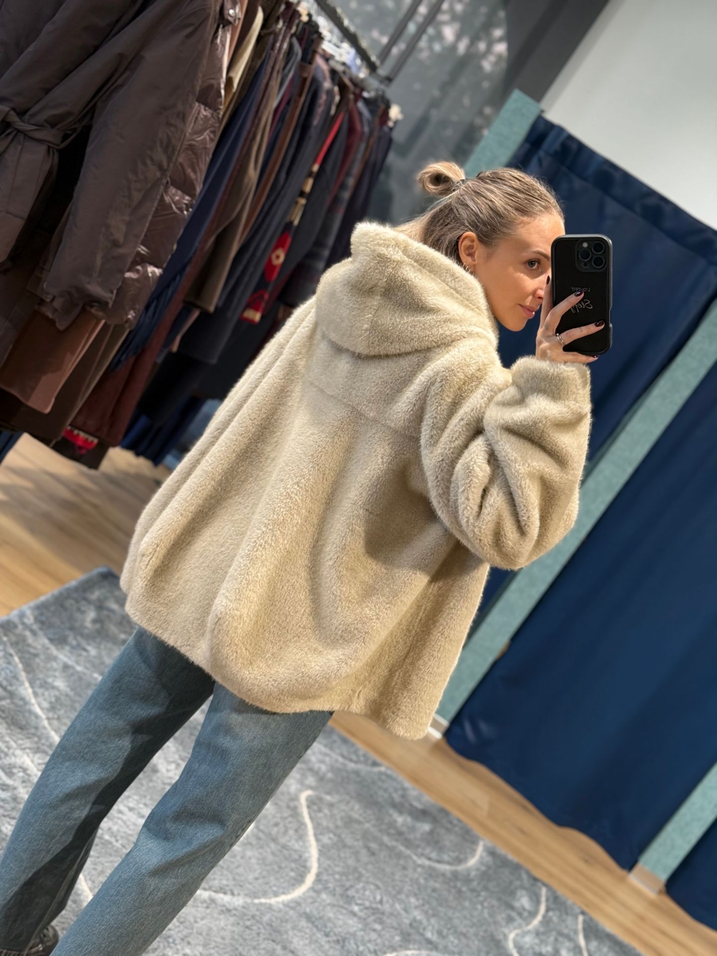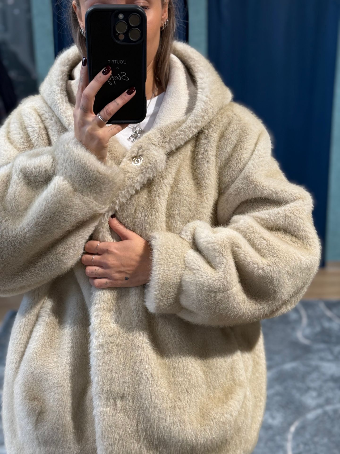 Ecopelliccia bomber con cappuccio e tasche. Chiusura con bottoni a pressione.