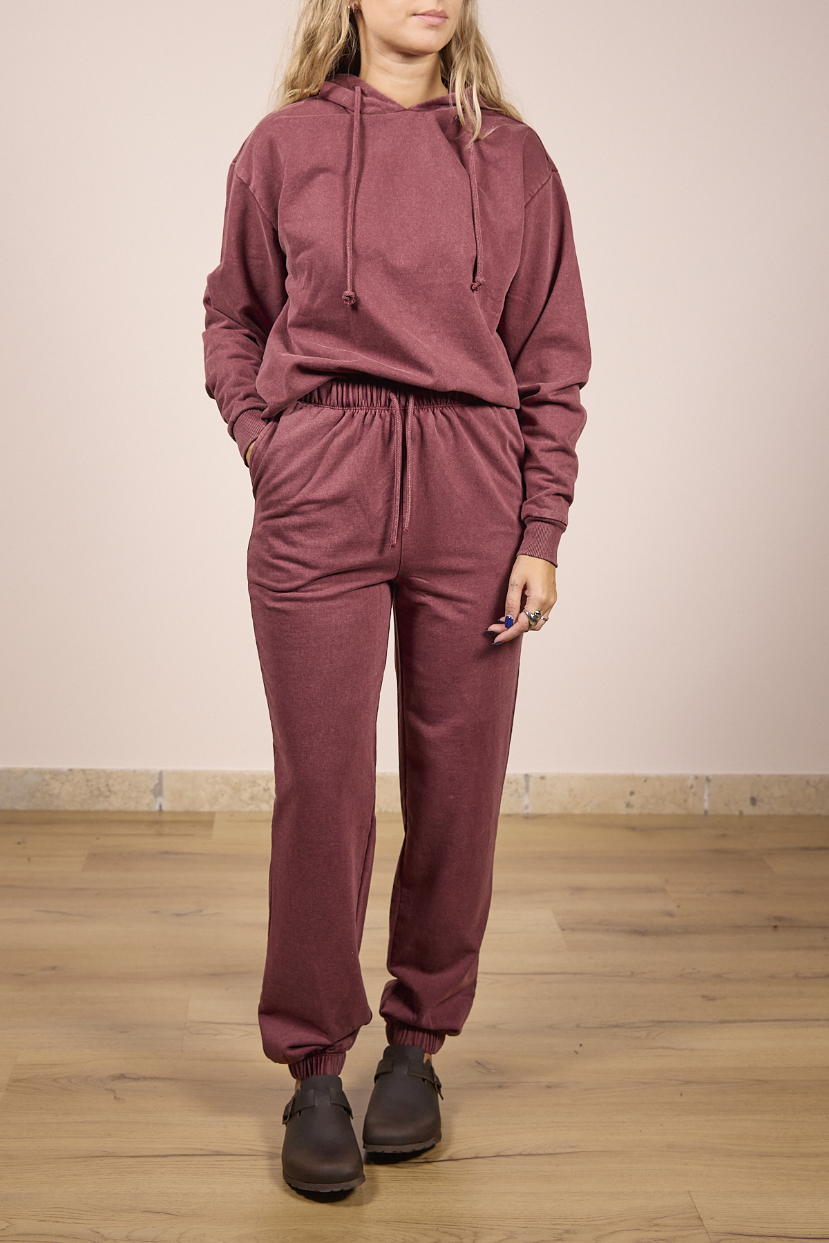 Pantalone tuta felpato lavaggio stonewash, con elastico in vita e polsino su caviglia