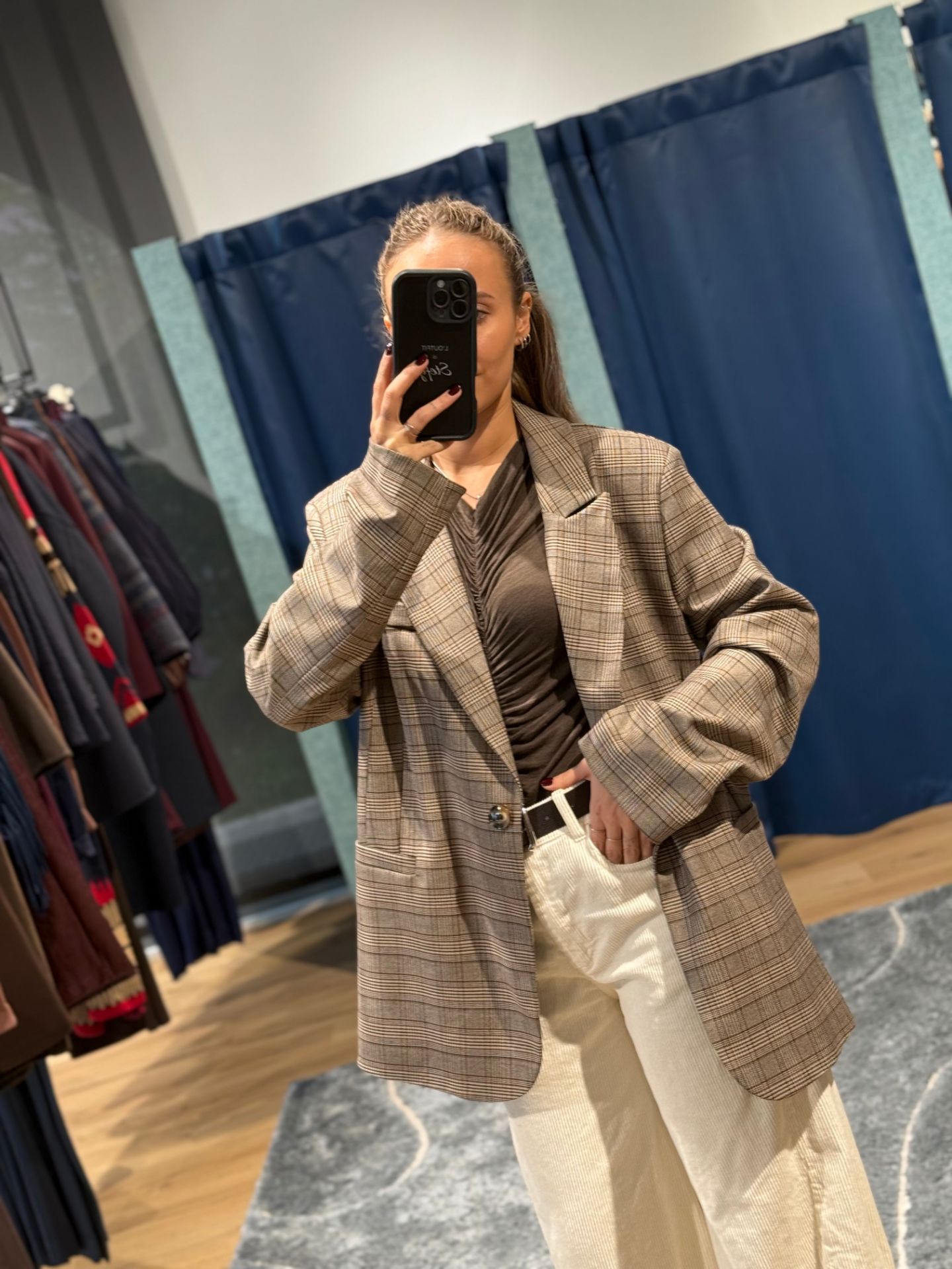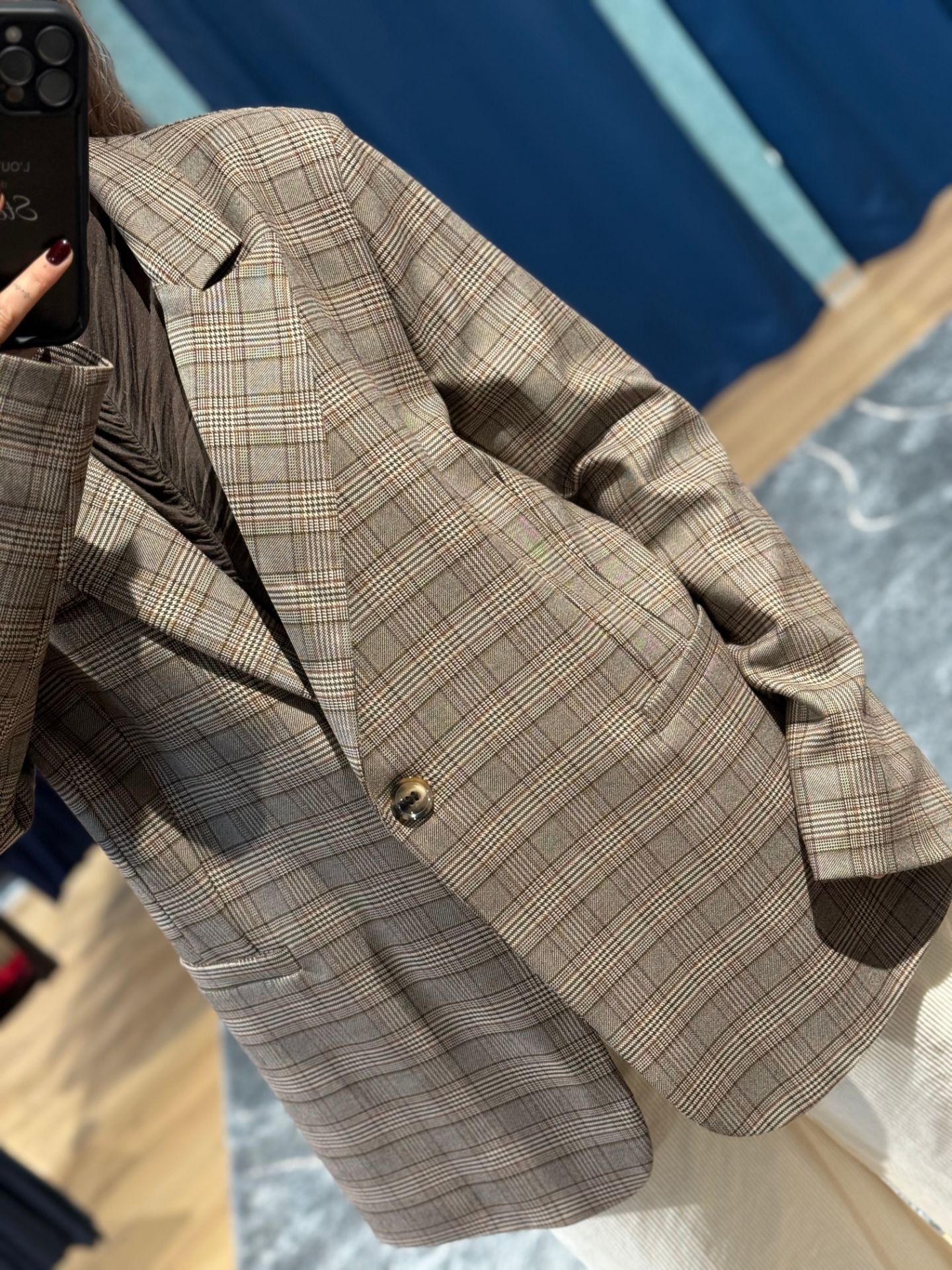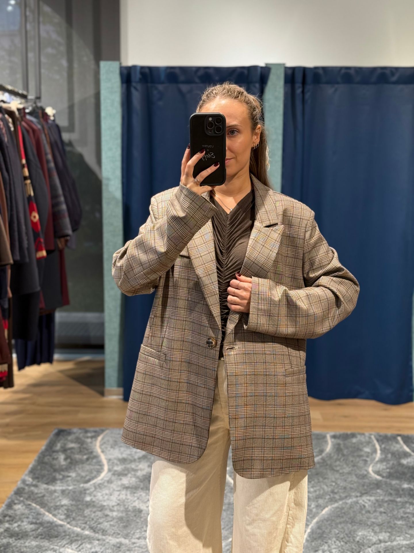 Giacca oversize a quadri con fodera leopardata. Chiusura un bottone. Vestibilità oversize.