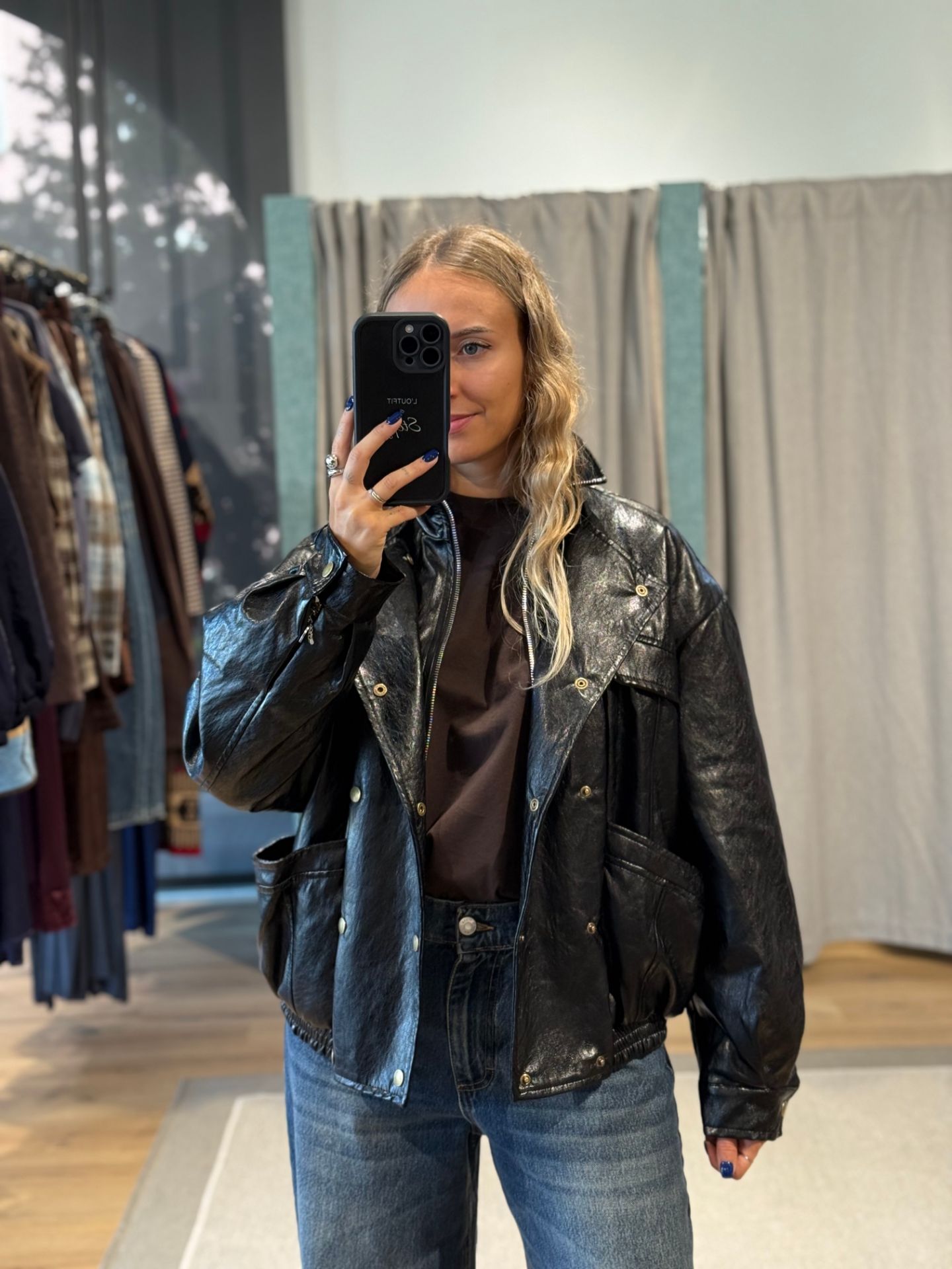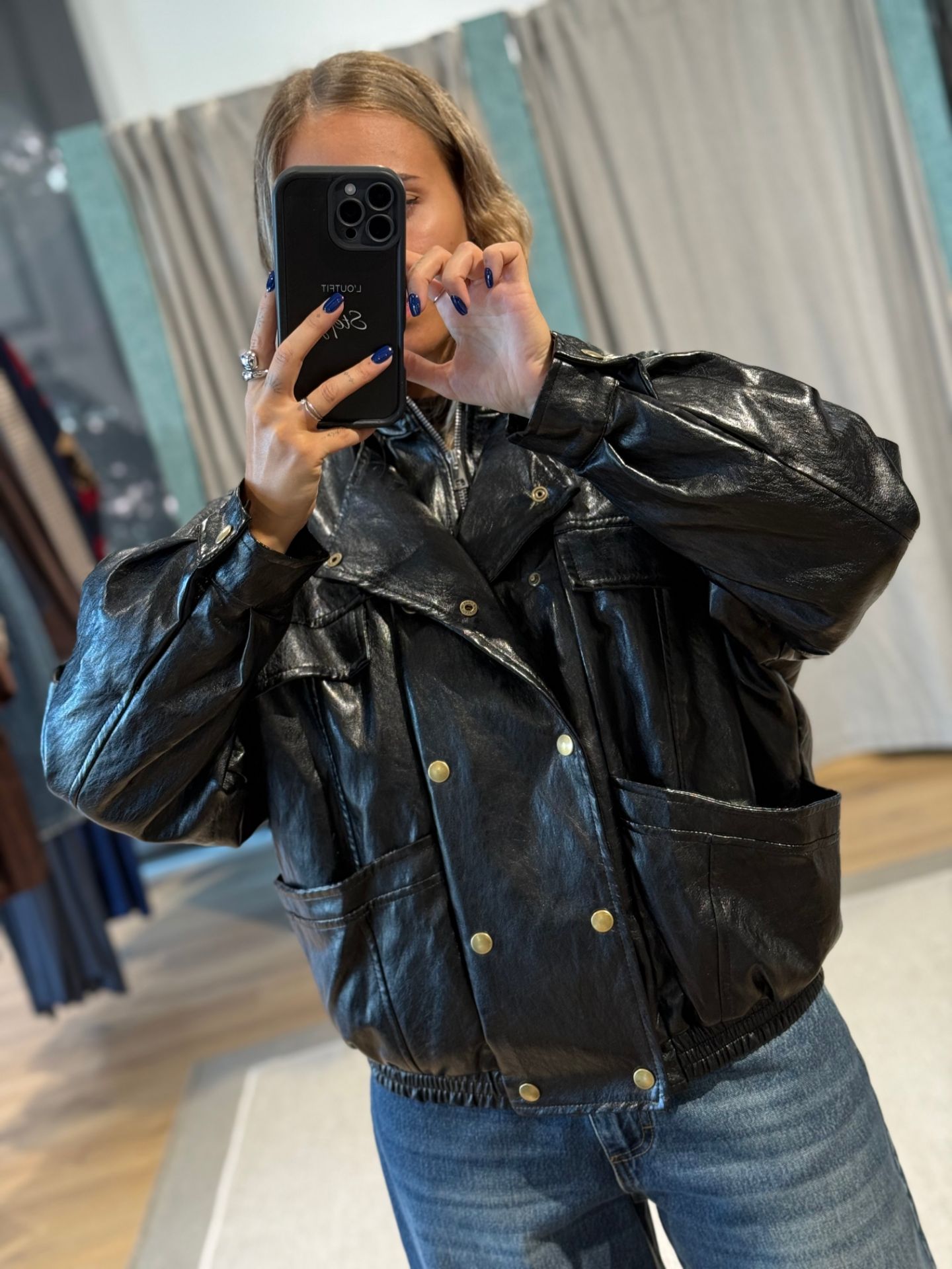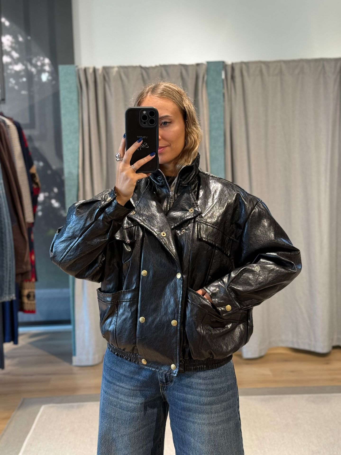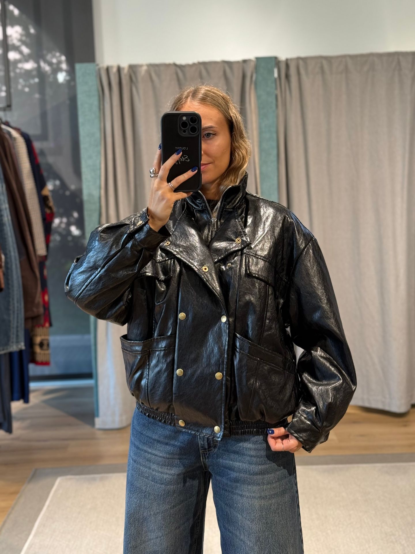 Giubbotto in ecopelle lucido foderato, dettaglio bottoni dorati 69% viscosa 14% poliestere 11% cotone 6% metallo