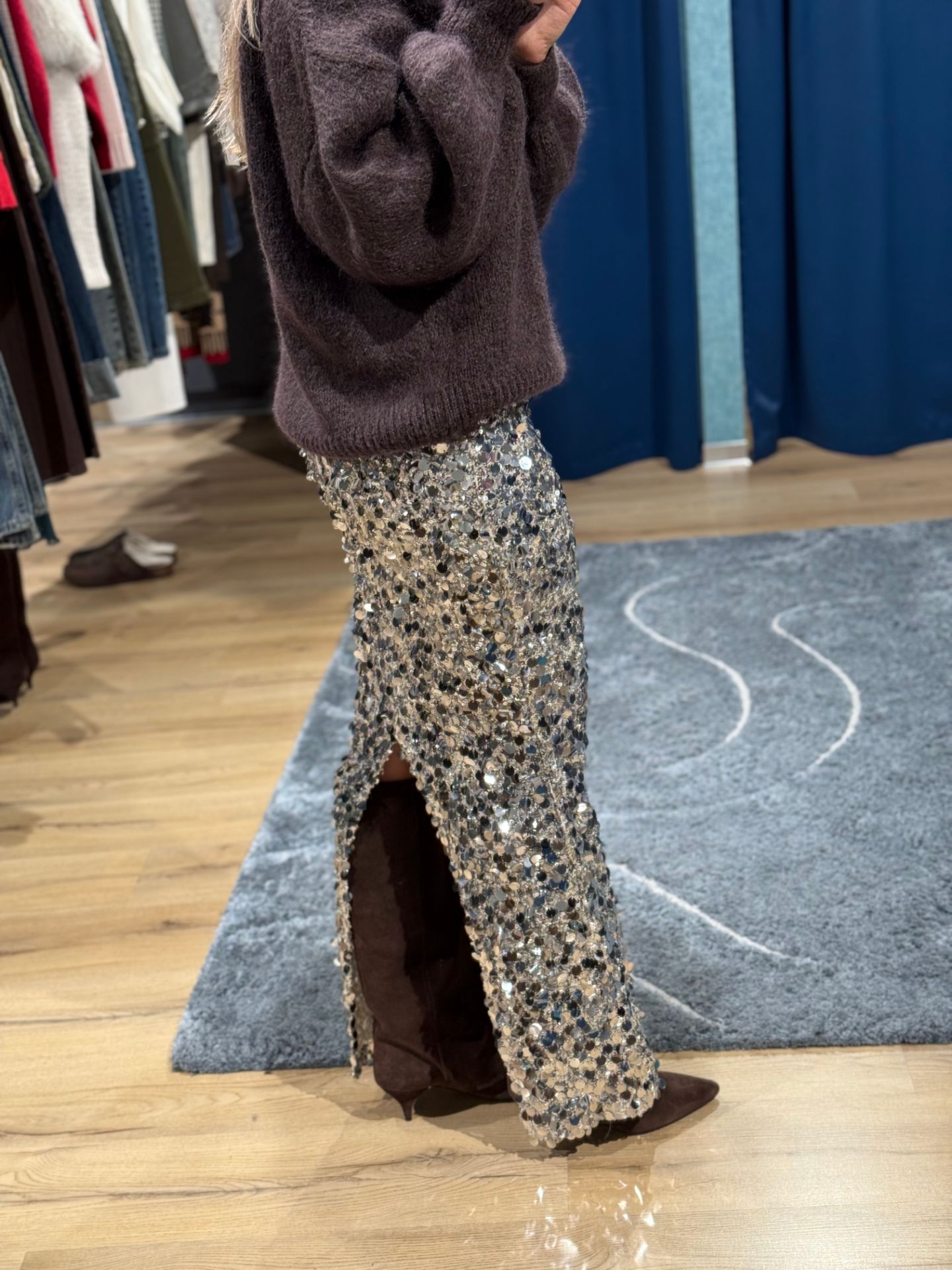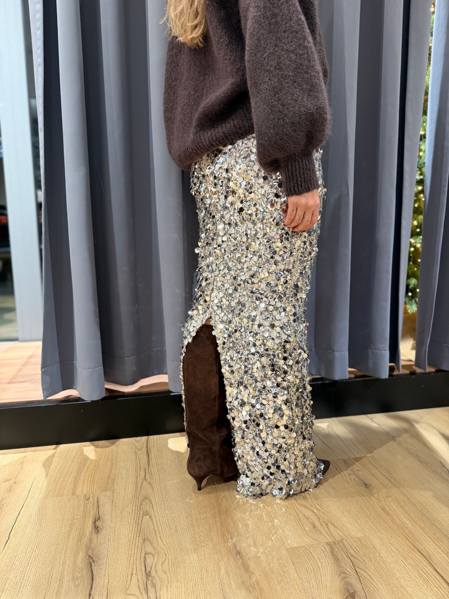 Gonna lunga paillettes a sirena con spacco sul retro.
