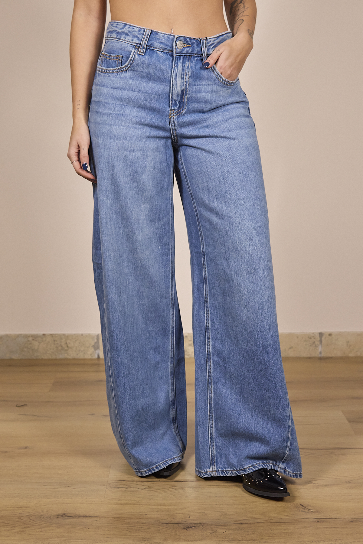 Jeans wide leg a vita alta, con particolare della cucitura laterale.