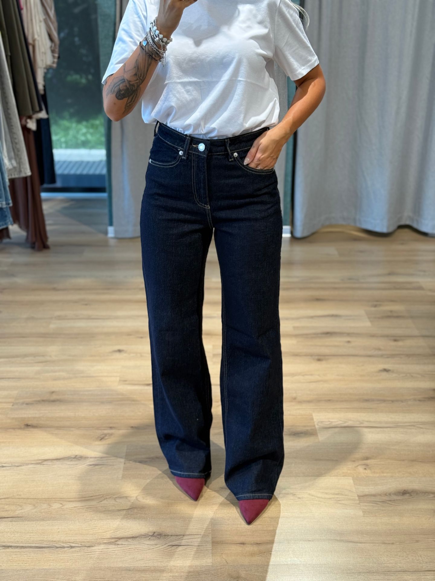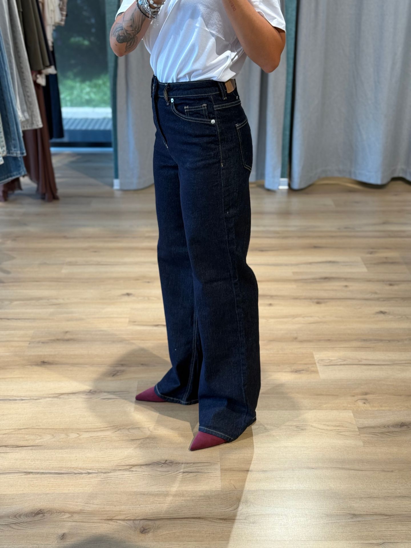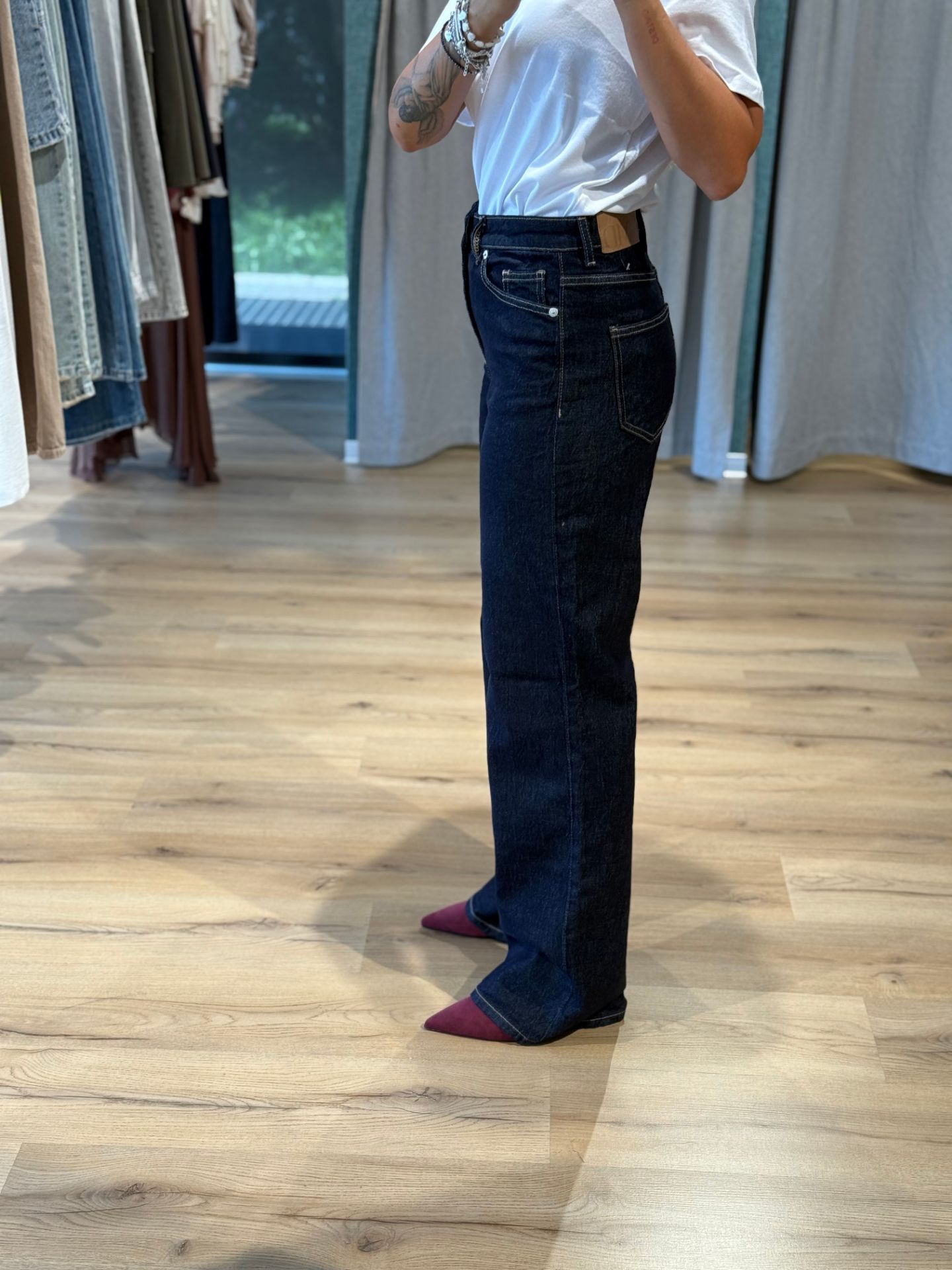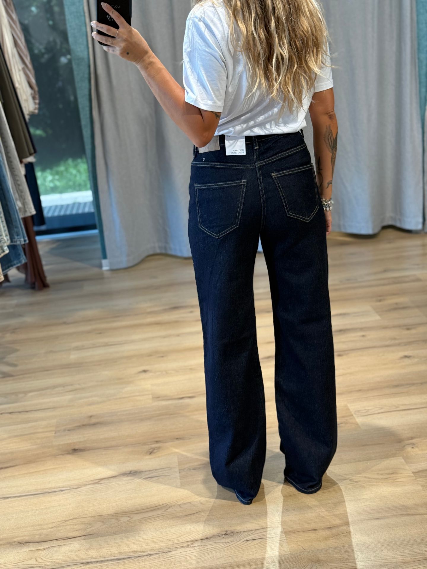 Jeans blu scuro a vita alta, gamba larga. TAGLIE AMERICANE (aggiungere +14 per ottenere la taglia italiana corrispondente) 79% Cotone 20% Coton recyclé 1% Elastan