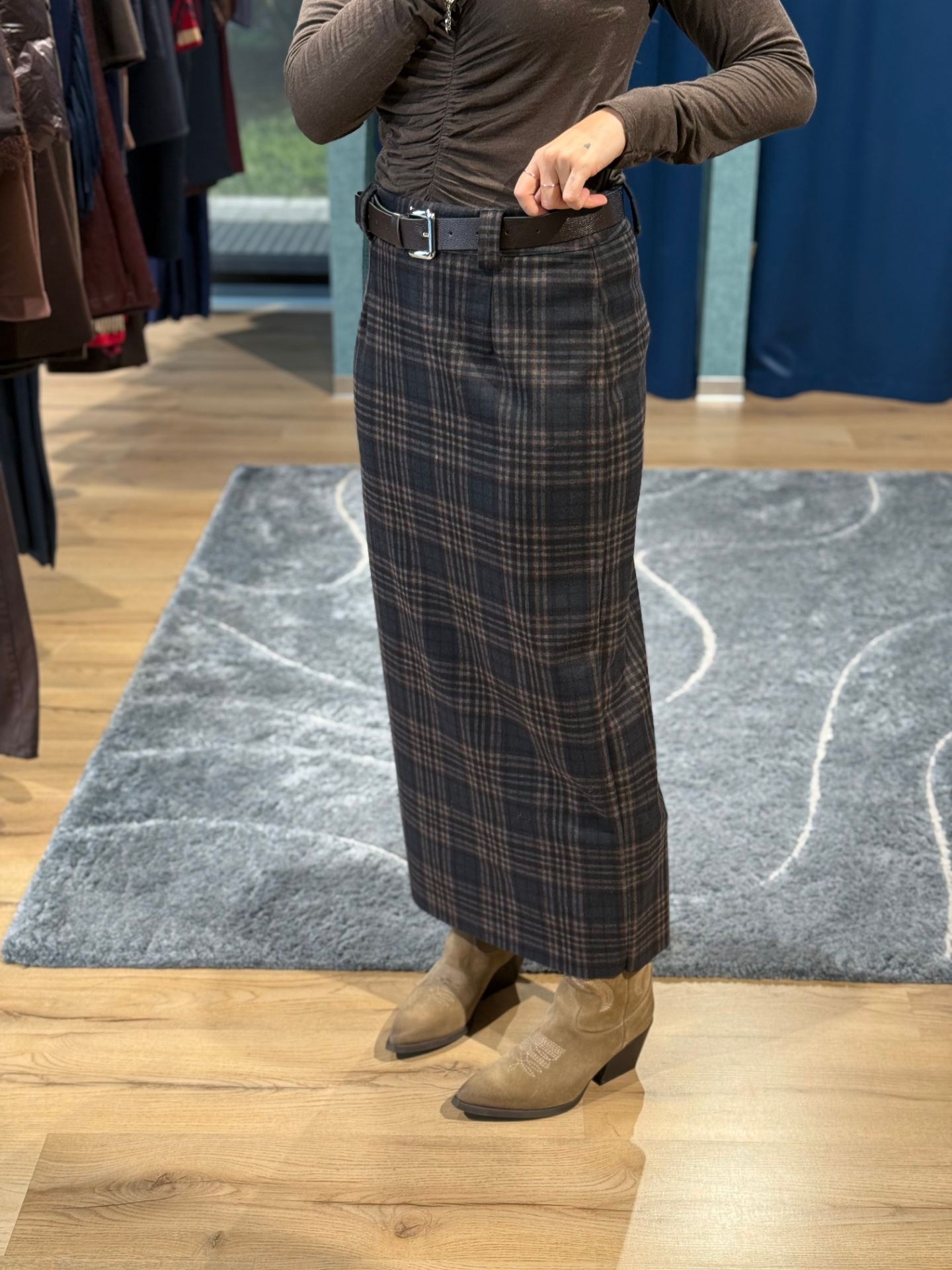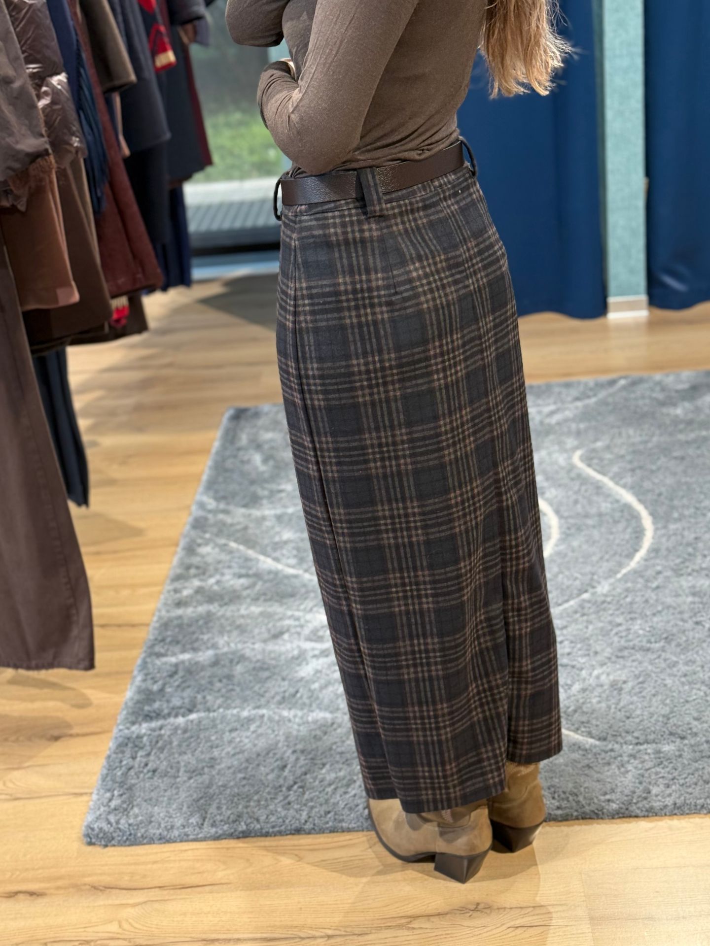 Gonna longuette a tubo fantasia tartan. Tessuto morbido.