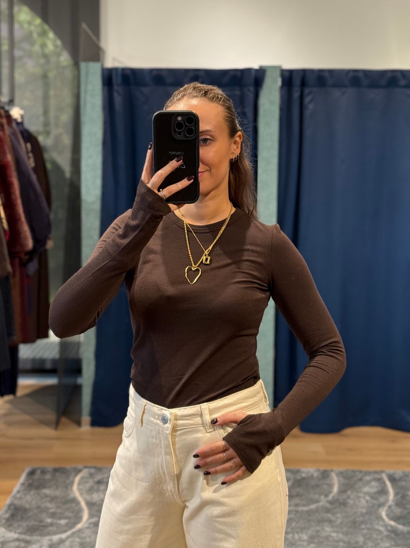 Maglia leggera perfetta come sotto giacca girocollo, manica a guanto con occhiello per pollice. 71% Modal 23% Lana 6% Elastane