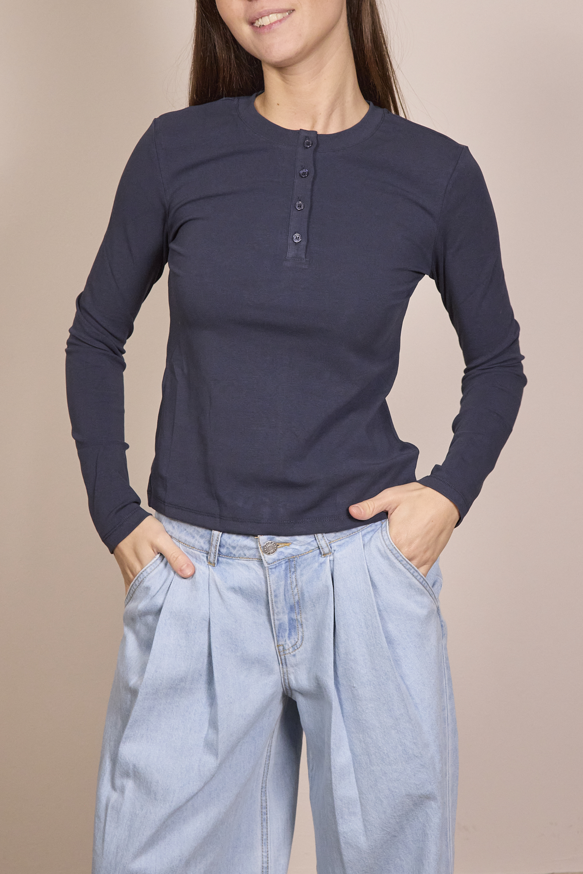 Maglia manica lunga girocollo con bottoncini, in cotone elasticizzato.