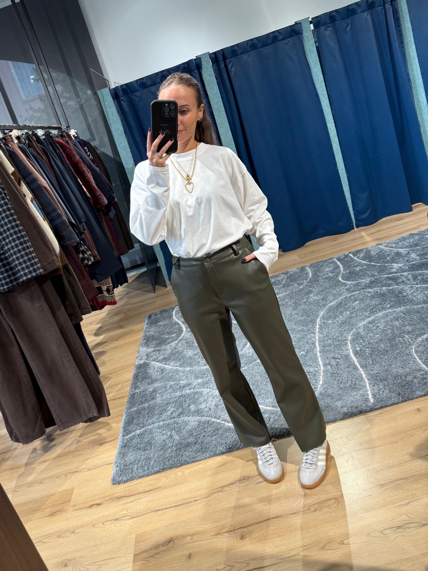 Pantalone a trombetta in simil pelle, felpato internamente, vestibilità regolare.