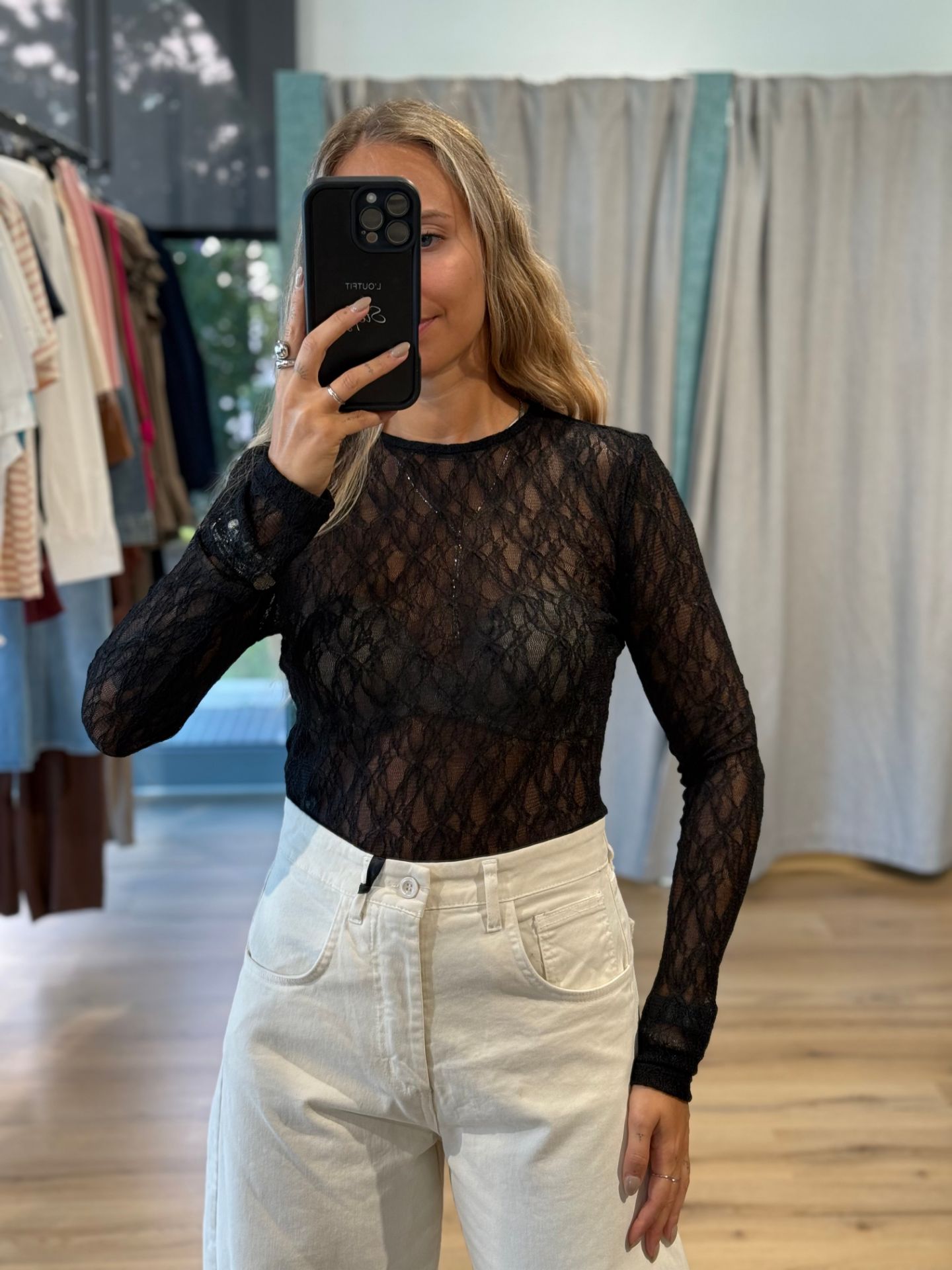 Top in pizzo girocollo a manica lunga, elasticizzato. 97% Poliestere riciclato 3% Elastan